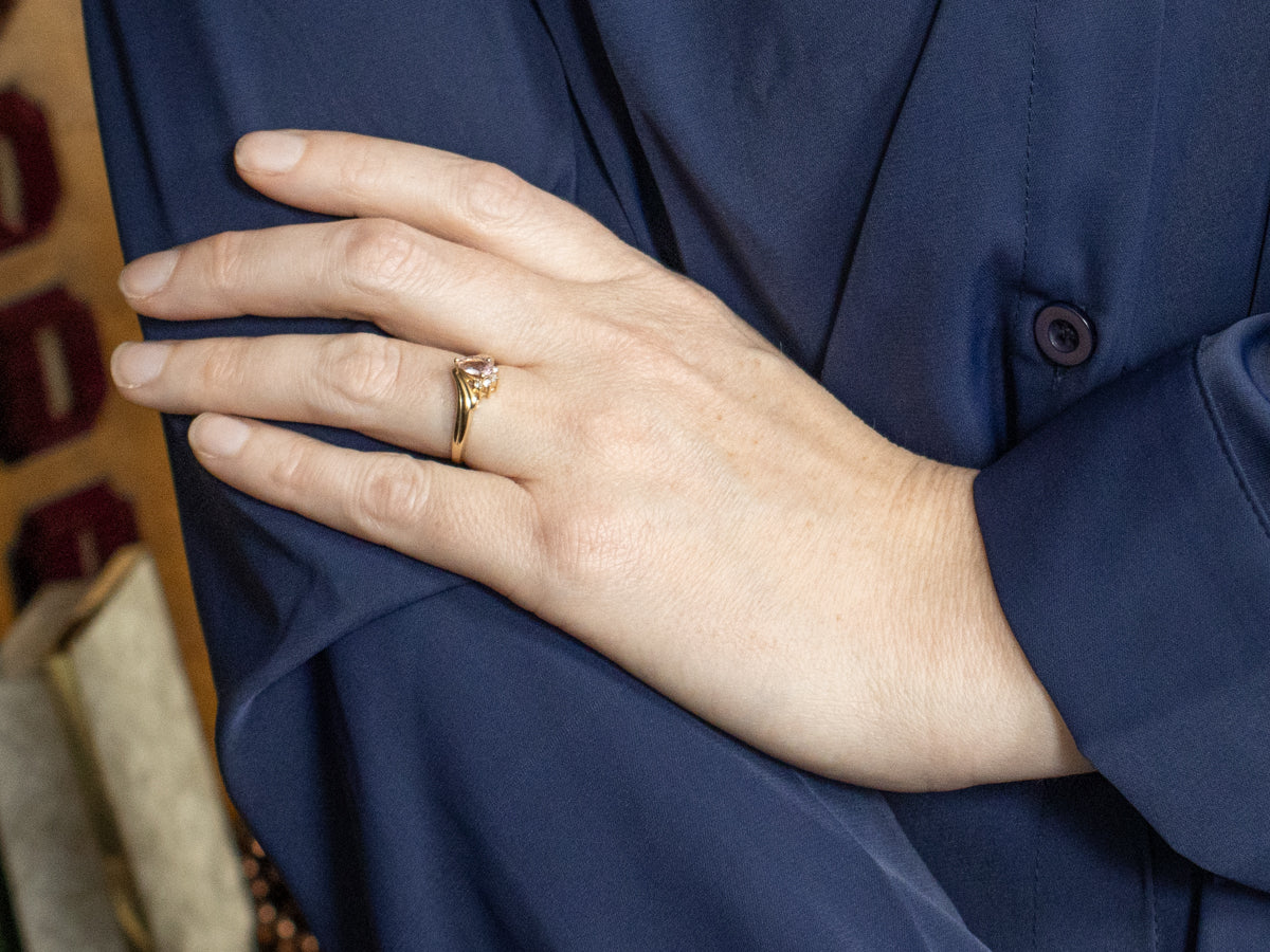 Metal: 14K Yellow Gold Gem: Pink Sapphire .57 Carats Gem Measurements: 4.3 x 6.5 mm, Pear Cut Accents: 5 Diamonds .04 Carats, H-I in Color, SI-I in Clarity Ring Size: 7.25 Marks: "14K" Stamped on the inside band