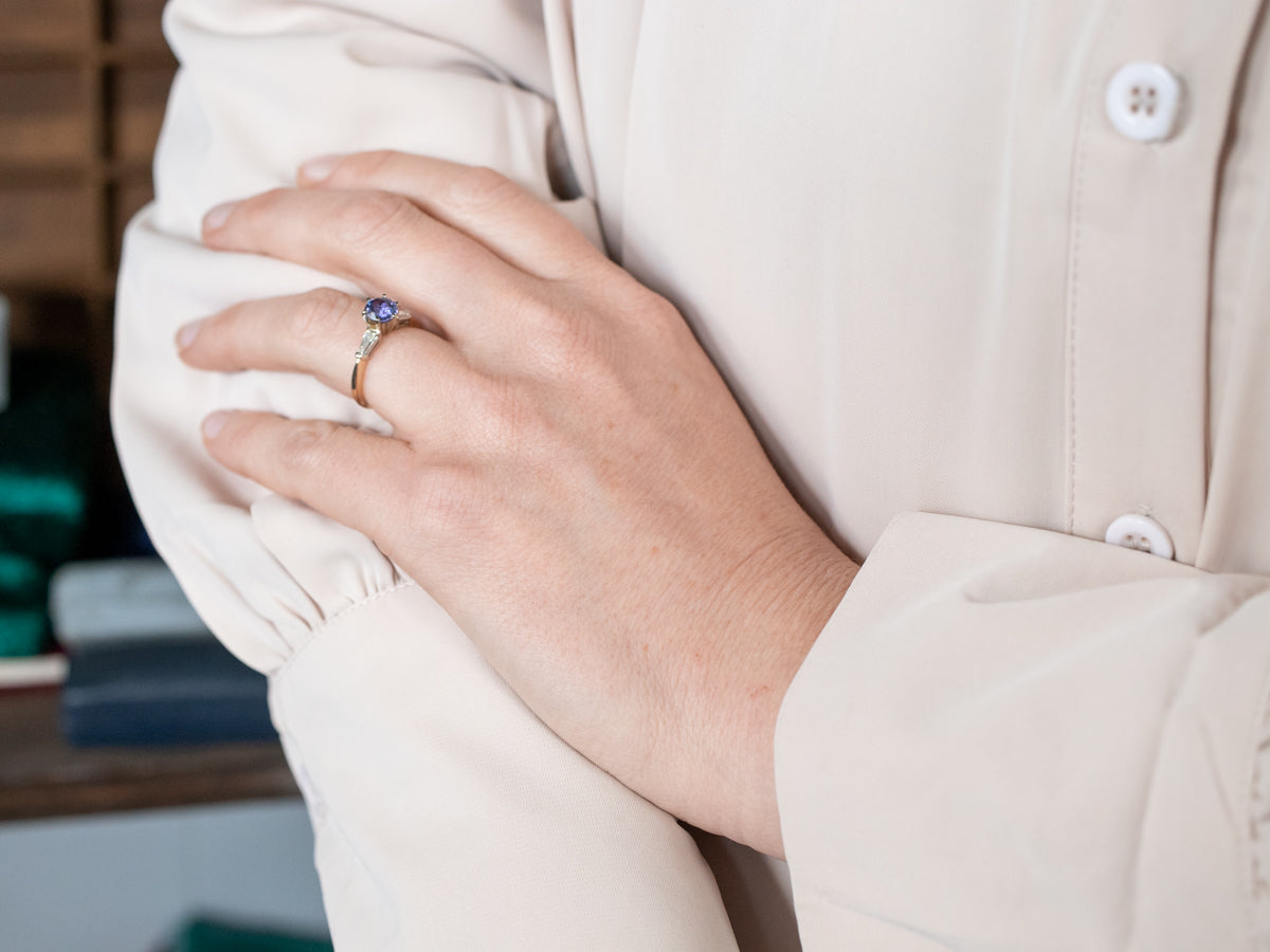 This exceptional engagement piece has great glitter for such a subtle, sophisticated piece! The centerpiece is a beautiful deep indigo sapphire of excellent quality, in rich, lilac and cornflower hues. We've set this into a classic mounting, with great baguette inlaid diamonds that gleam brilliantly!
