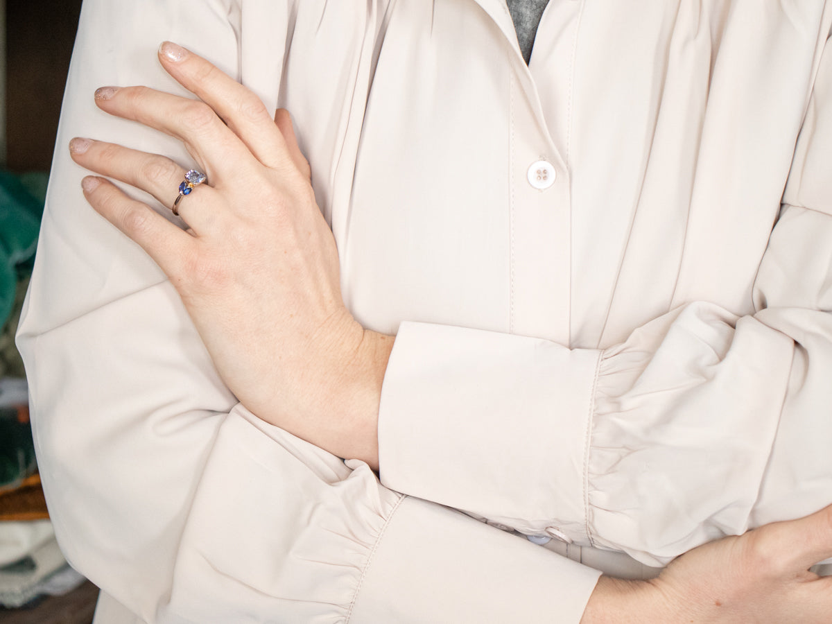 This gorgeous ring features two shades of sapphire: lavender and blue! The lavender shines with periwinkle undertones, and the deep navy blue marquise-cut sapphires on the sides are a perfect compliment.