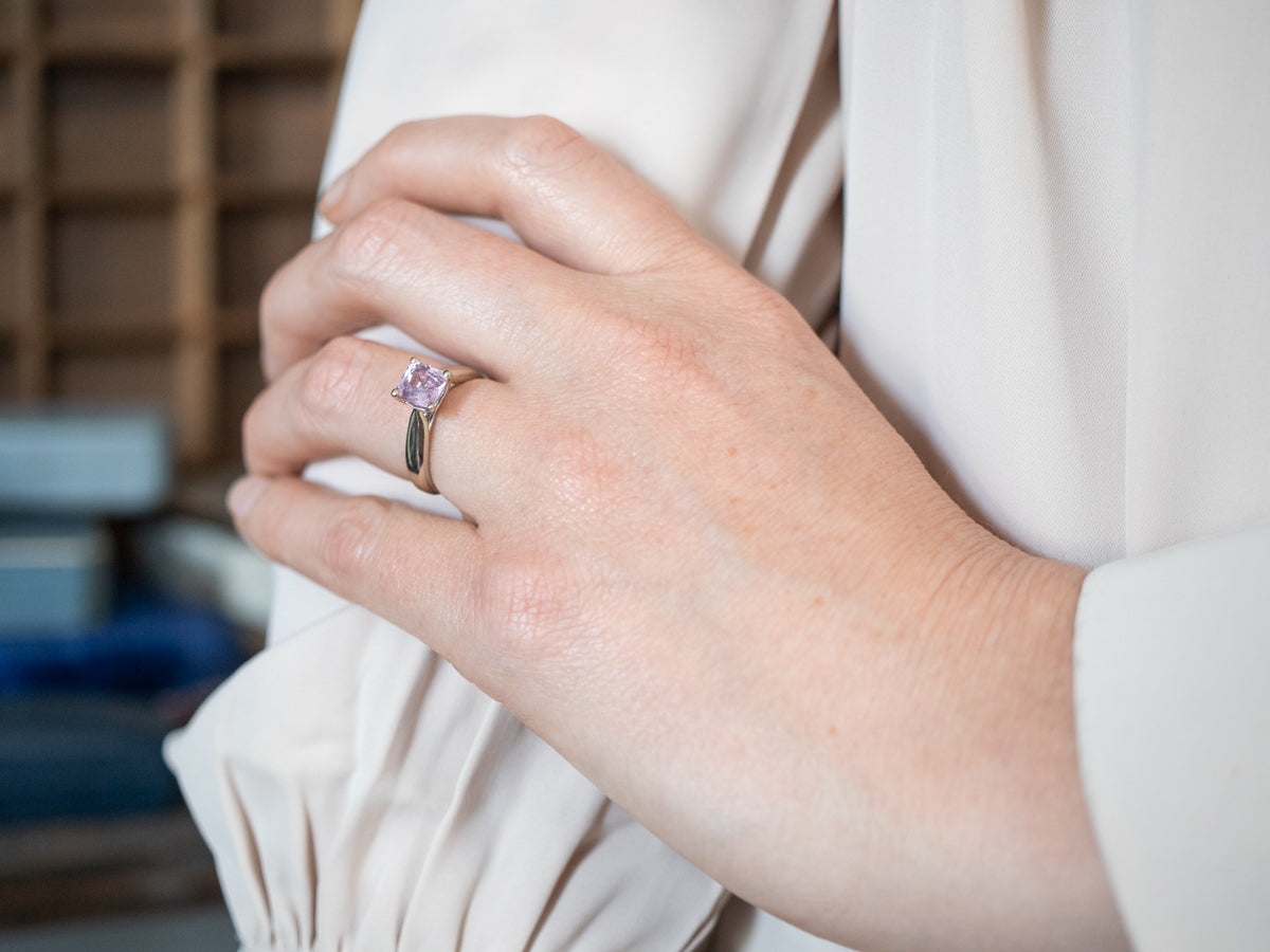 Truly all about the stone, this traditional, white gold mounting frames the stone perfectly while holding it securely with four prongs. The center pops with an amazing pink color and is adorned with an expertly cut pink sapphire.