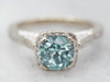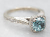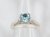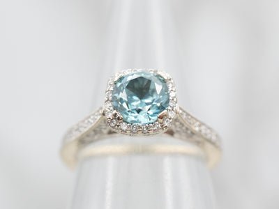 Metal: 14K White Gold Gem: Blue Zircon 1.29 Carats Gem Measurements: 5.9 mm, Round Accents: 70 Diamonds totaling .42 Carats, SI in Clarity, G-H in Color Ring Size: 4.25 Marks: “14K” Stamped on the inside band