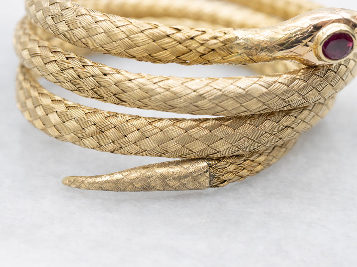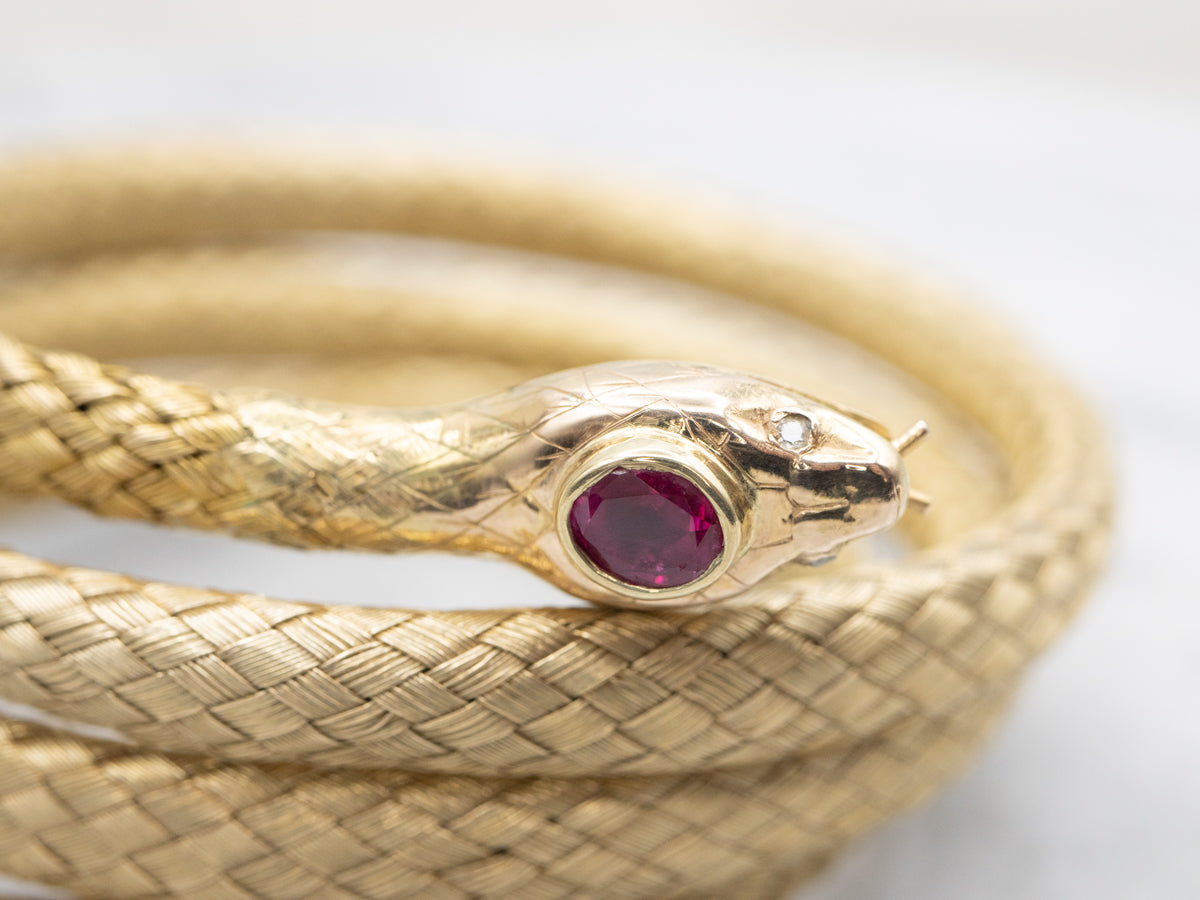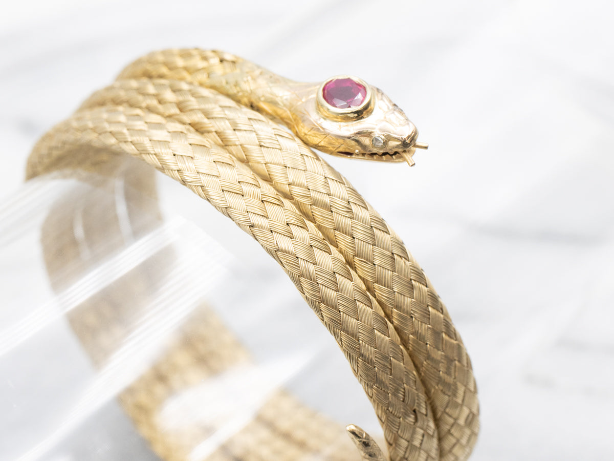 The Victorian period began an obsession with spiritualism and esoterica, which transformed in the Art Nouveau period into a simple reverence for nature. Botanical and animal motifs abounded, including the ancient and ever-popular snake. A representative of change and rebirth, snake jewelry has remained popular throughout the decades. This stunning piece is crafted of woven 14-karat yellow gold, set with a fine ruby and sparkling diamond eyes!
