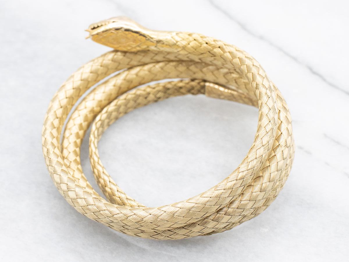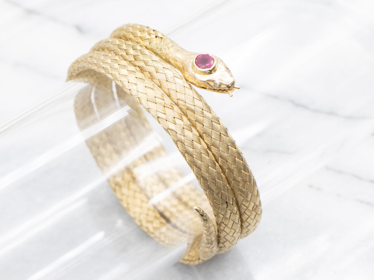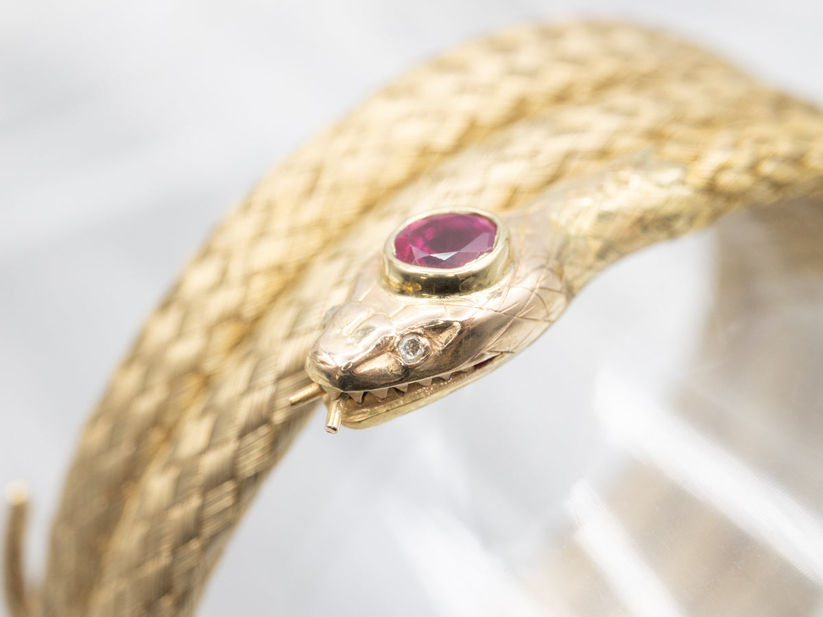 The Victorian period began an obsession with spiritualism and esoterica, which transformed in the Art Nouveau period into a simple reverence for nature. Botanical and animal motifs abounded, including the ancient and ever-popular snake. A representative of change and rebirth, snake jewelry has remained popular throughout the decades. This stunning piece is crafted of woven 14-karat yellow gold, set with a fine ruby and sparkling diamond eyes!