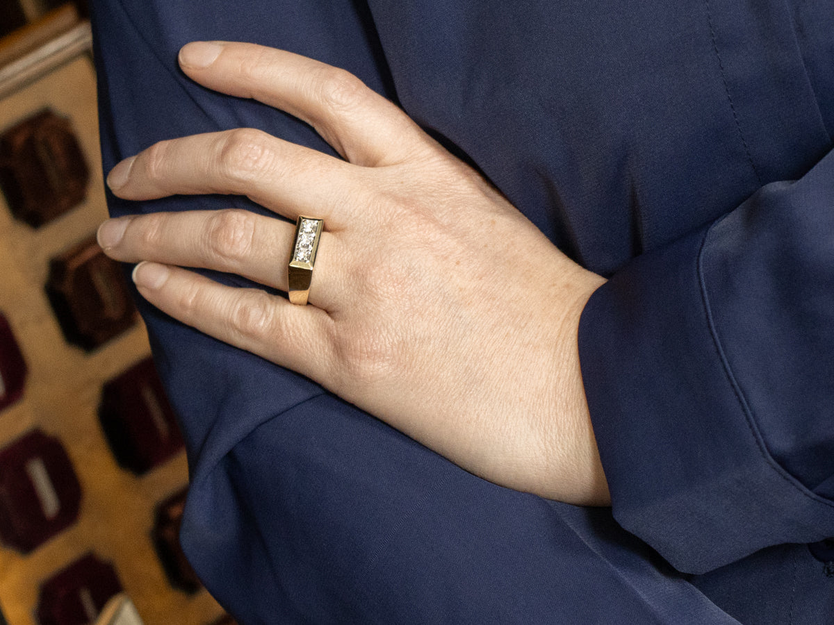 This beautiful yellow gold ring is perfect for making a statement! Crafted with three round-brilliant diamonds, it's perfect for carrying a treasured sentiment of love, joy, or friendship in a unique and sparkly way! Show off your gleaming style with this versatile and eye-catching piece of jewelry!