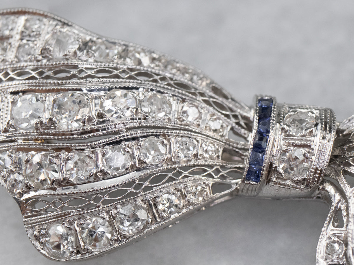 ¡La delicada filigrana tachonada de diamantes en forma de encaje de este alfiler es la definición misma de la era Art Déco! Creada mediante estampado, incluso la mejor filigrana de esta época es increíblemente fuerte y resistente. El centro de esta belleza está engastado con diamantes brillantes y zafiros azules brillantes, ¡un dulce sentimiento para la persona que amas!