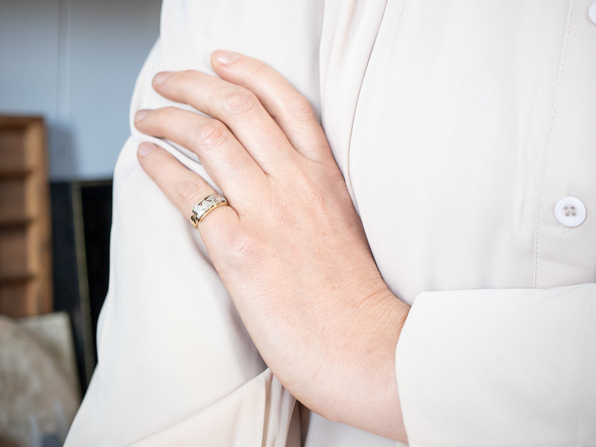 Polished yellow and white gold forms the gracefully flowing branch of this gorgeous diamond band. Sparkling and shining, the diamonds create a cool contrast to the vibrantly warm gold. This piece would make a special wedding band or romantic gift!