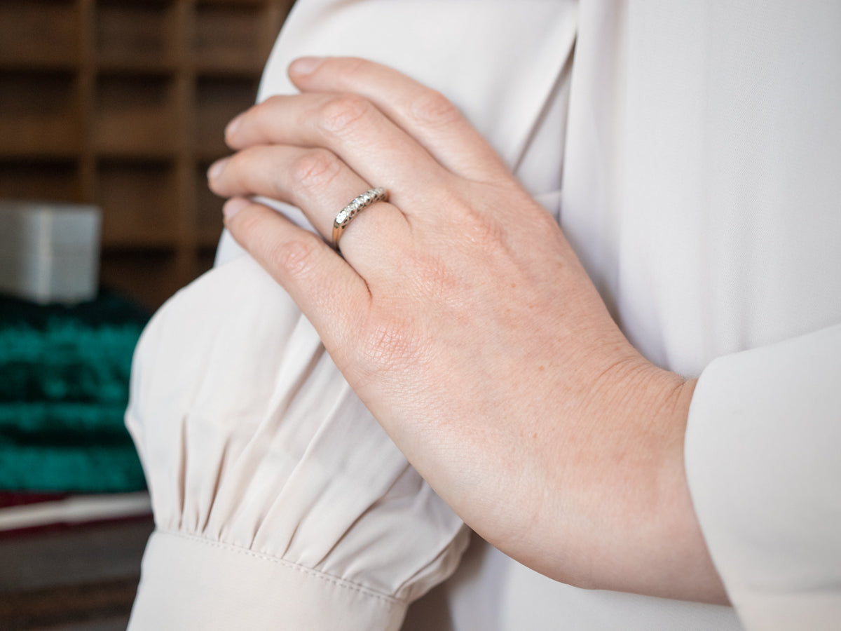 Just slightly more modern in design than the classic Retro era pieces, this vintage yellow gold wedding band will look well alongside a variety of engagement rings. The diamonds are bright and gleaming, set in a white gold scalloped undercarriage that is both secure and enhancing!