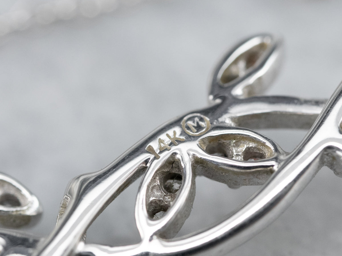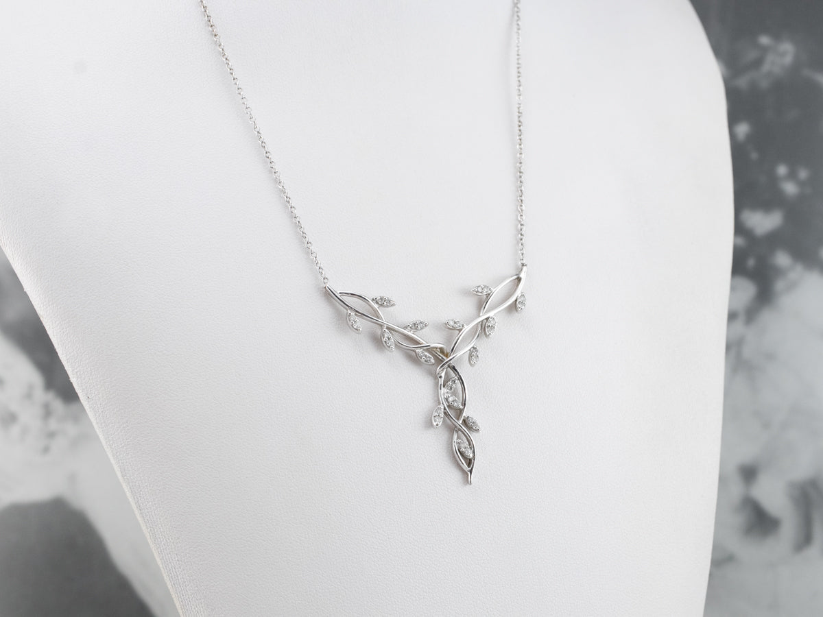 Polished stylized branches of white gold seem tossed in a gentle breeze in this lovely necklace. Bright well matched diamonds shine at the tips of the branches, link small buds ready to open into full-fledged flowers.