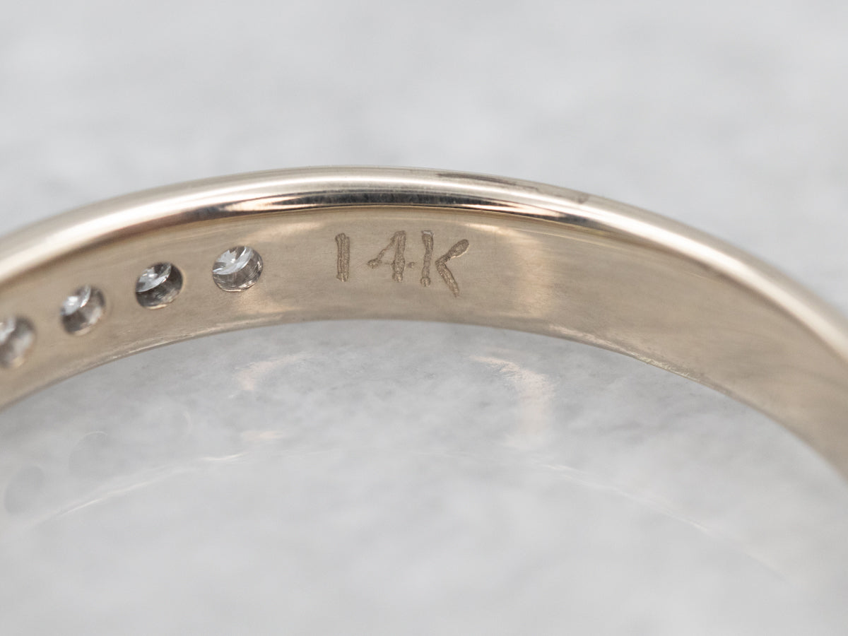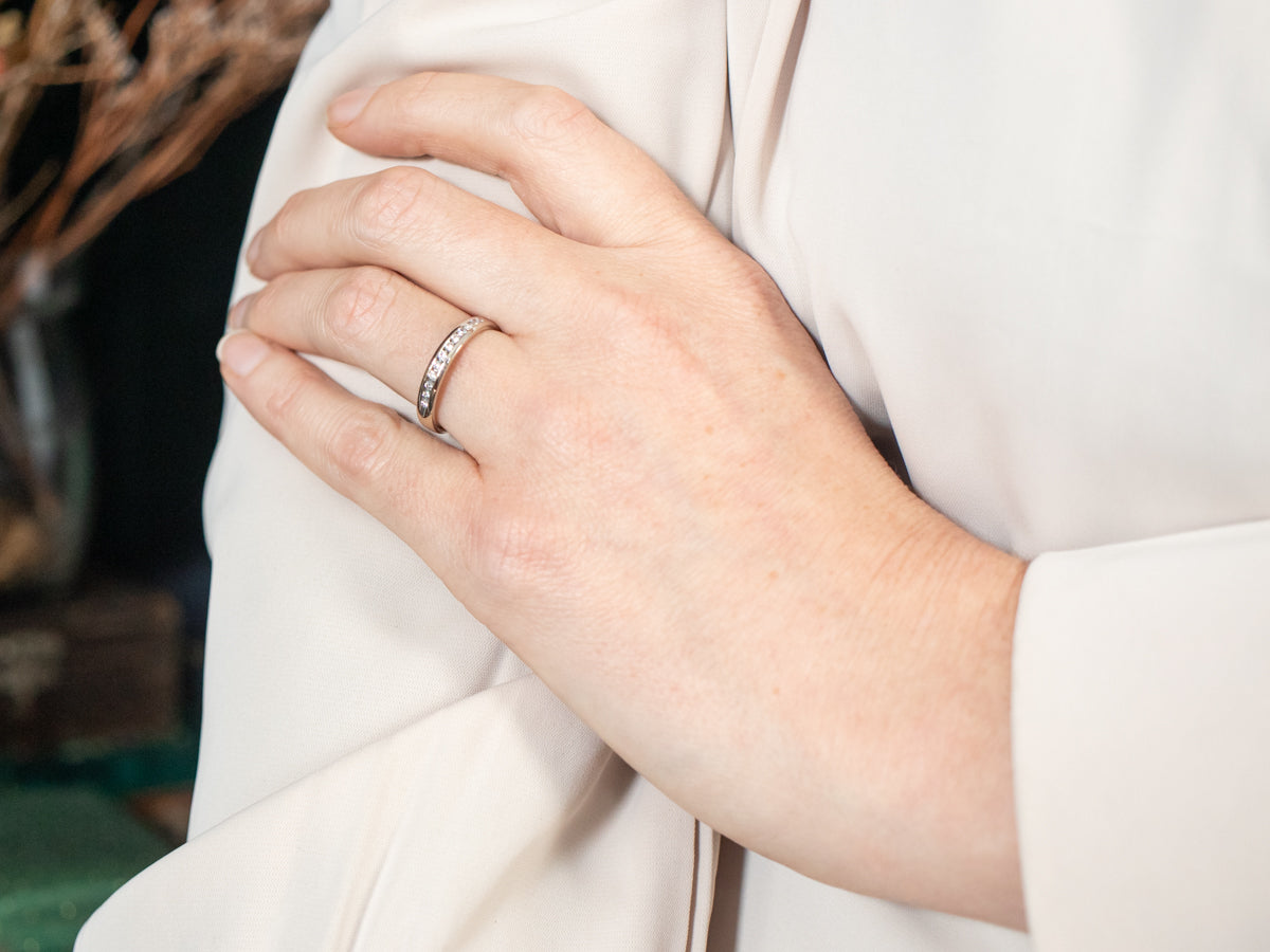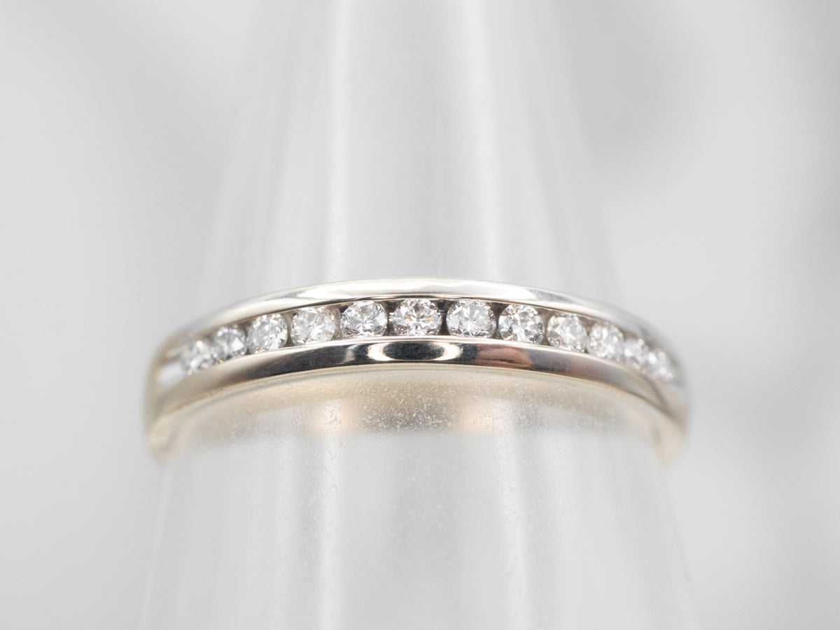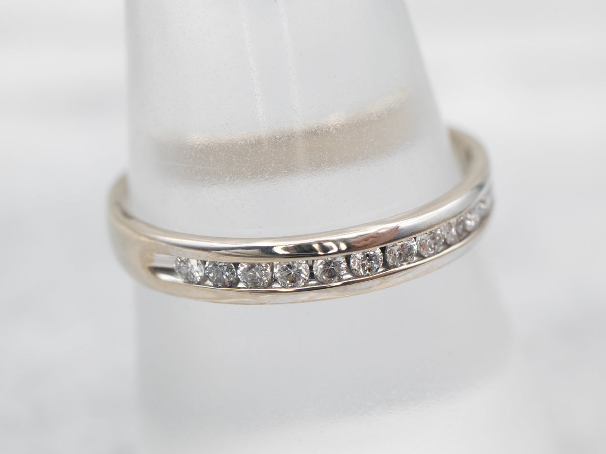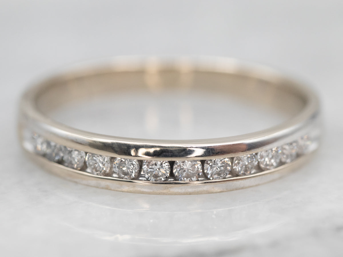 This channel-set diamond band is well-proportioned and comfortable on the hand. The white gold perfectly compliments the bright and sparkling diamonds. We love the long row of glittering round diamonds, elegant and timeless!