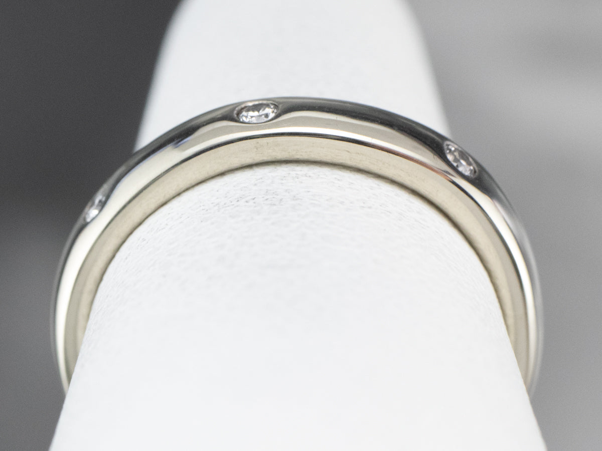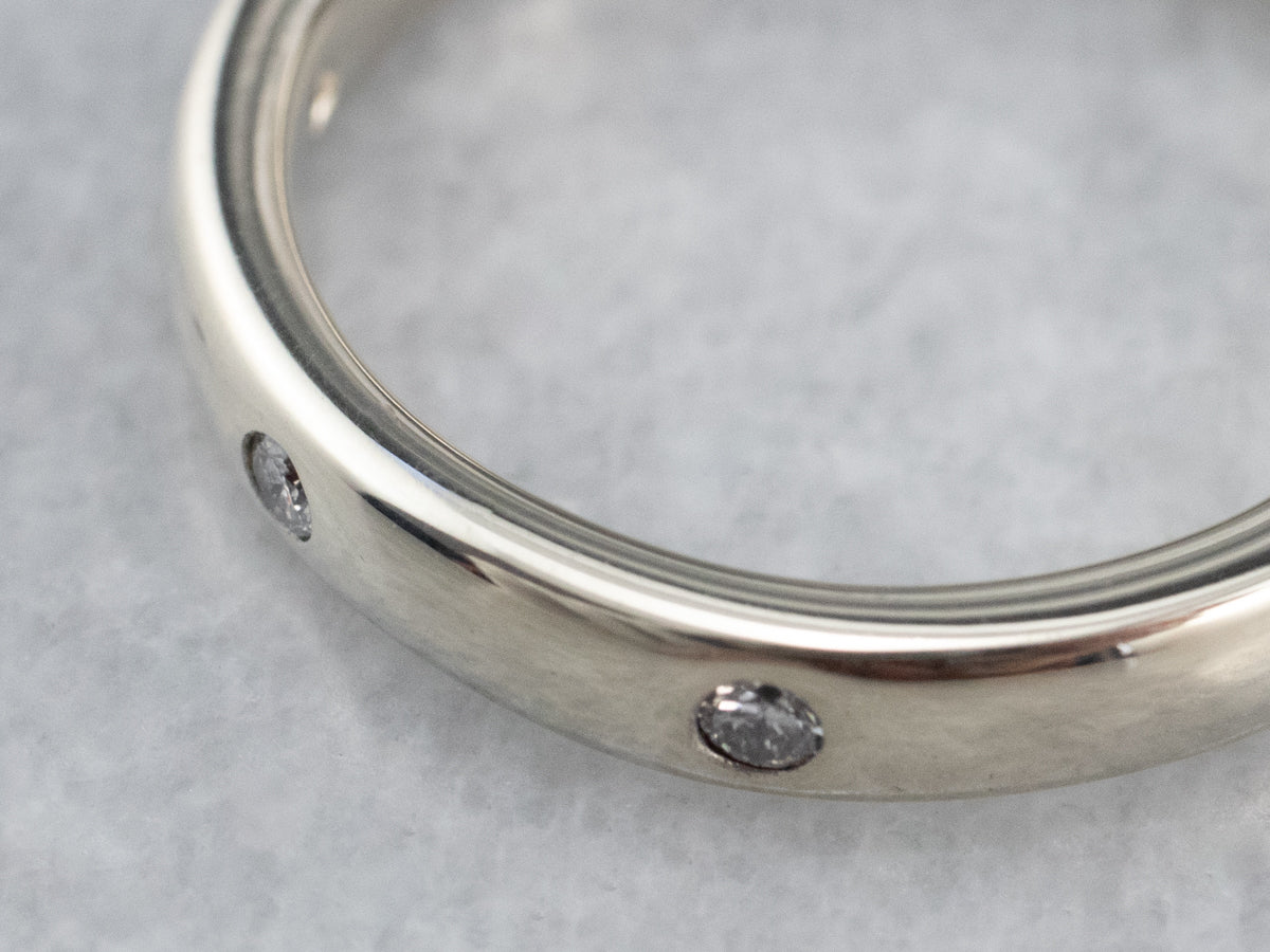 Like stars in a misty night sky, this etoile band contrasts bright, glittering diamonds with a brightly polished white gold band. The inside of the band is gently curved, giving the band a comfortable fit on the finger.