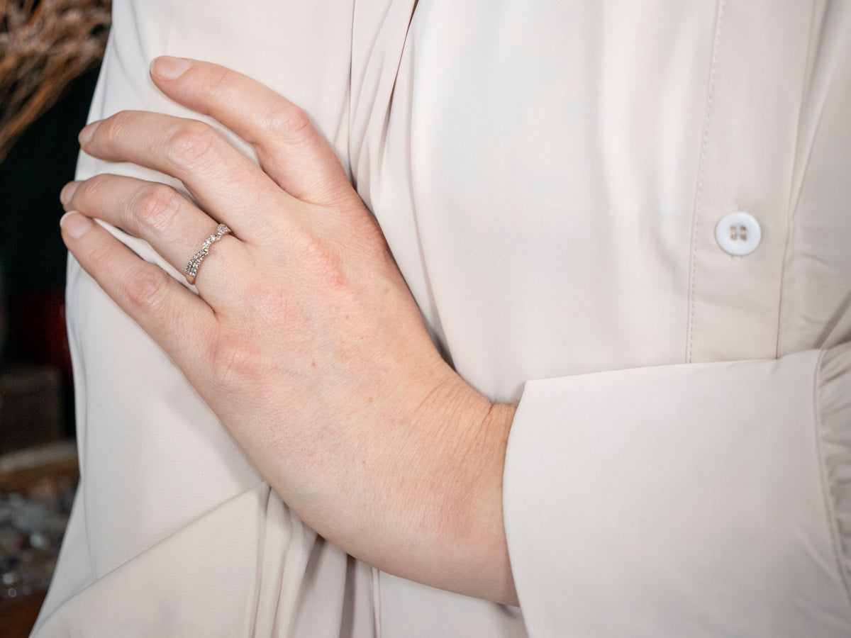 Metal: oro blanco de 14 quilates. Gema: 27 diamantes con un total de 0,25 quilates, claridad SI2, color H Ancho de la banda: 3,3 mm Altura del dedo: 5,6 mm Medida de espacio: 5,6 mm Tamaño del anillo: 6.50 Marcas: "14K" estampado en la banda interior