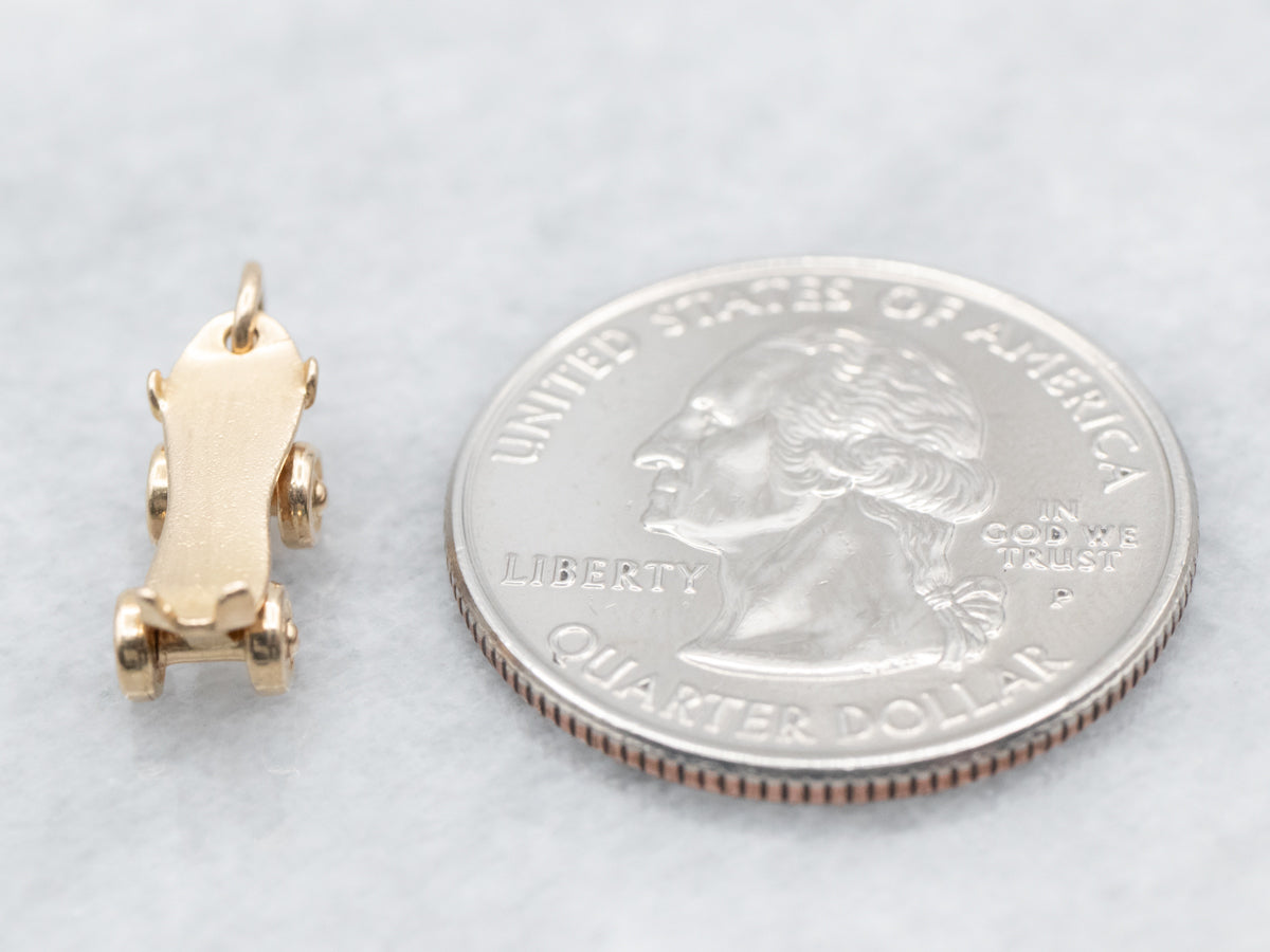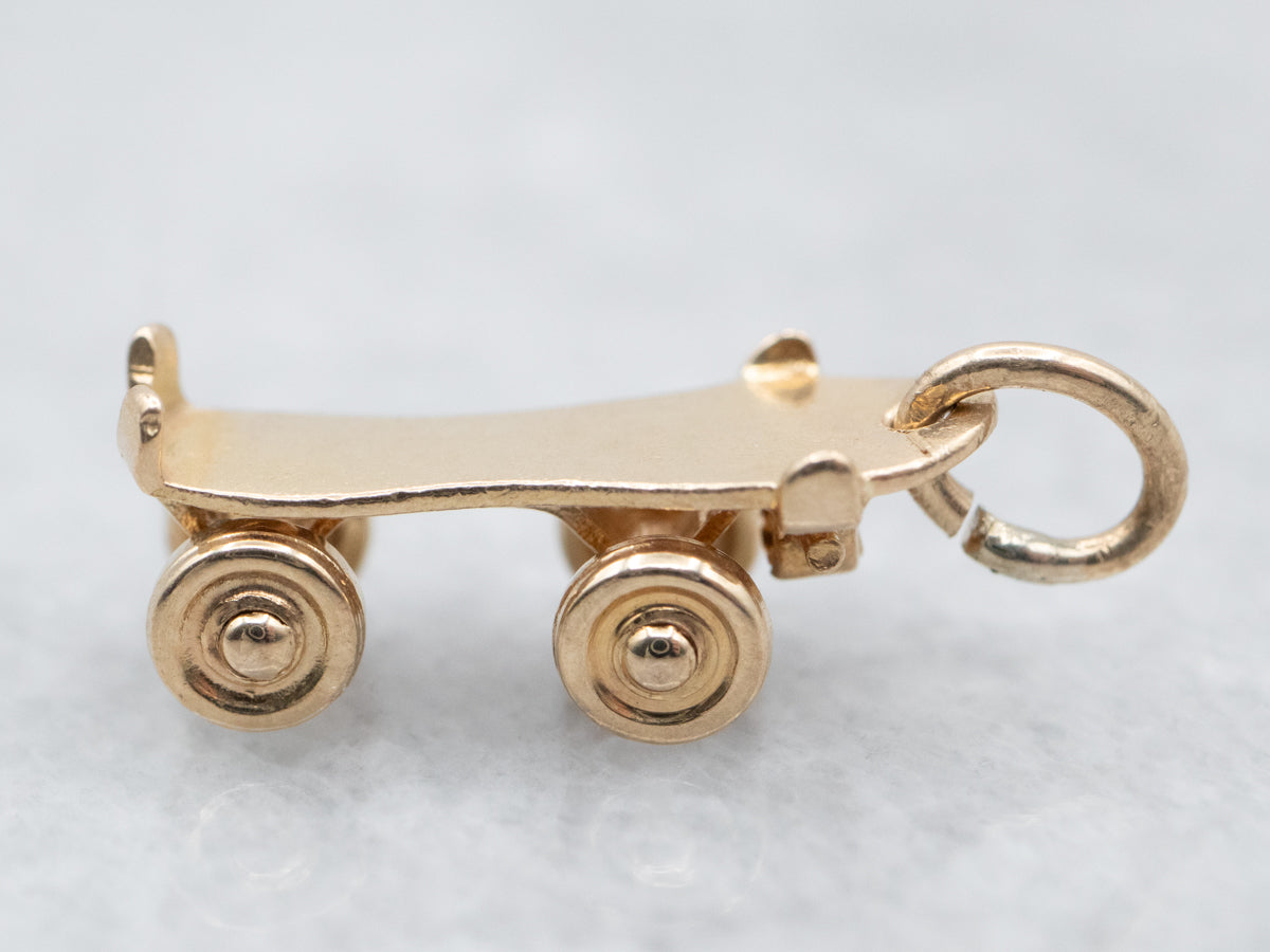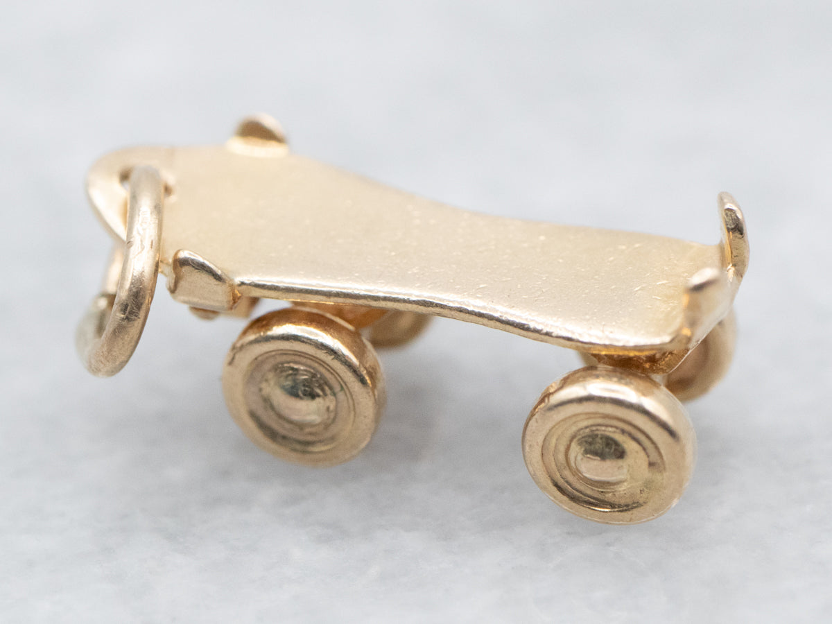 ¡Fantásticos detalles entran en juego en este colgante vintage para patines! Las pequeñas ruedas giran y giran, haciendo que el pequeño patín realmente avance.