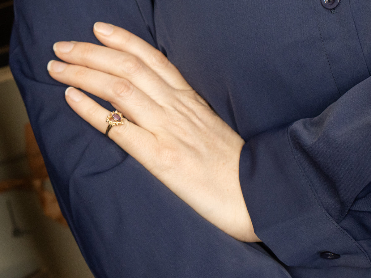 This sweet gold halo ring is giving off some major lovey-dovey vibes! A bright lavender-hued amethyst has been cut into a lovely oval, surrounded by a radiant halo of high-quality diamonds in a heart-shaped halo! This is a stunning piece featuring a classic combination of colors and packs a big statement, without being overwhelming or ostentatious!
