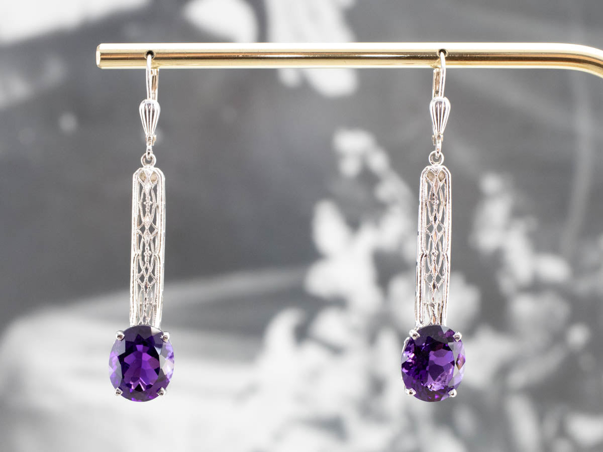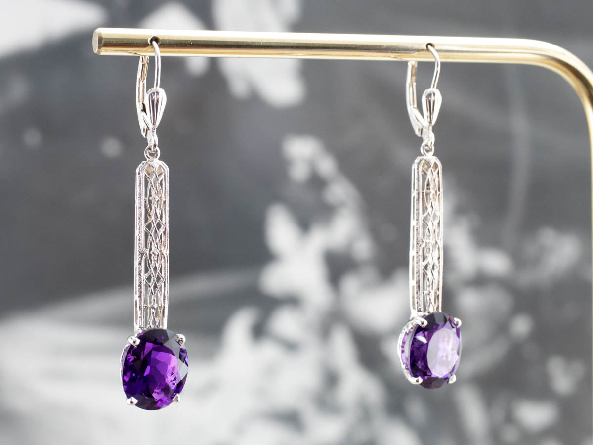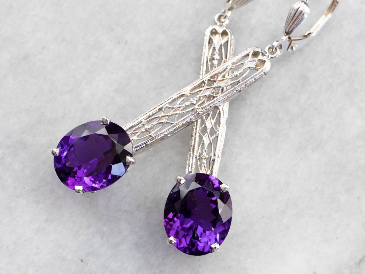 Audaces y profundamente saturadas, ¡estas gemas son preciosas! ¡El color es un morado intenso y verdadero con muchos destellos! La barra del centro es de oro blanco antiguo y de hermosa textura. Creamos estos aretes usando un pasador de barra de la época Art Déco.