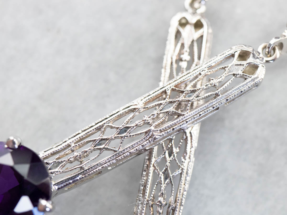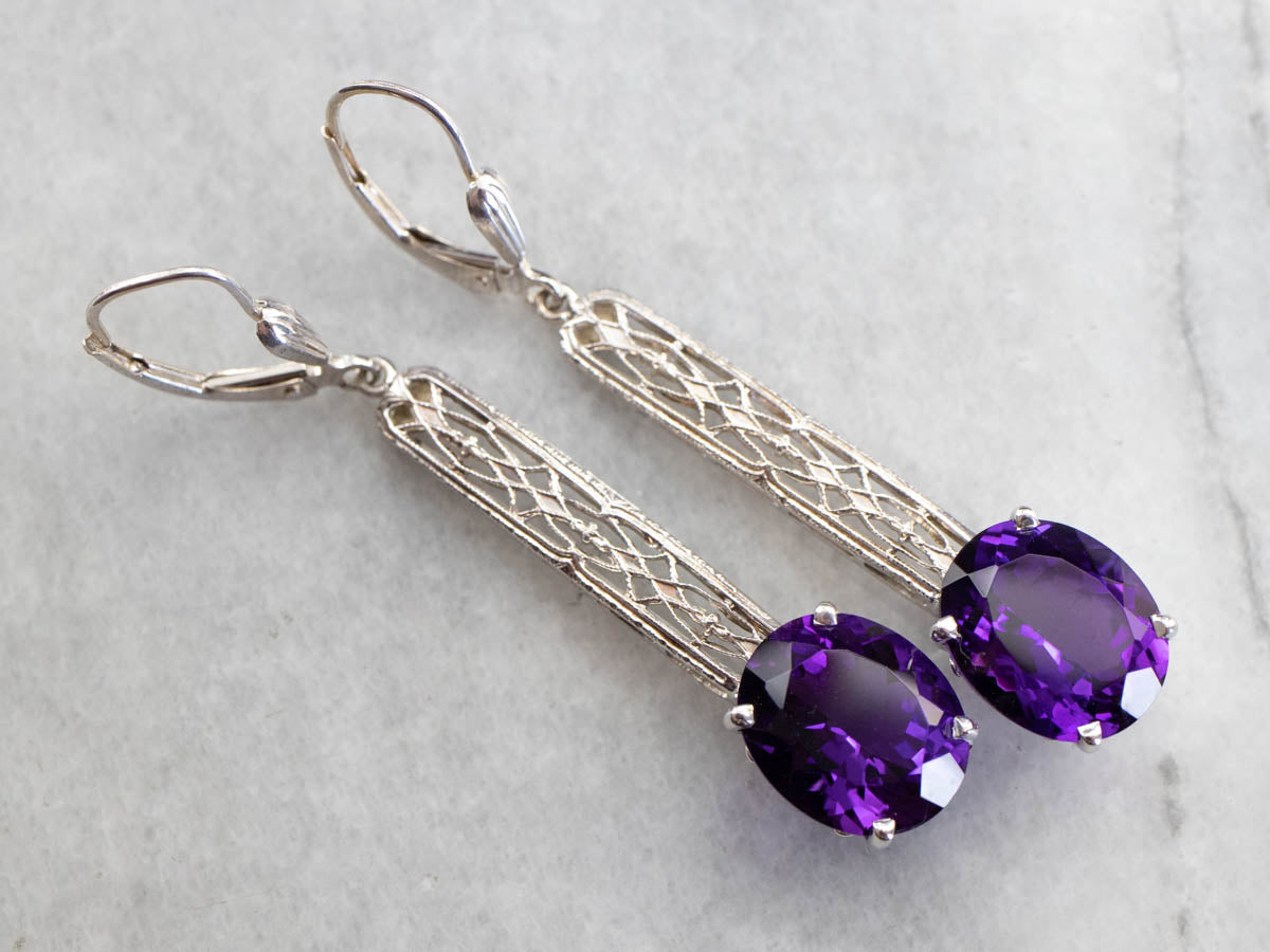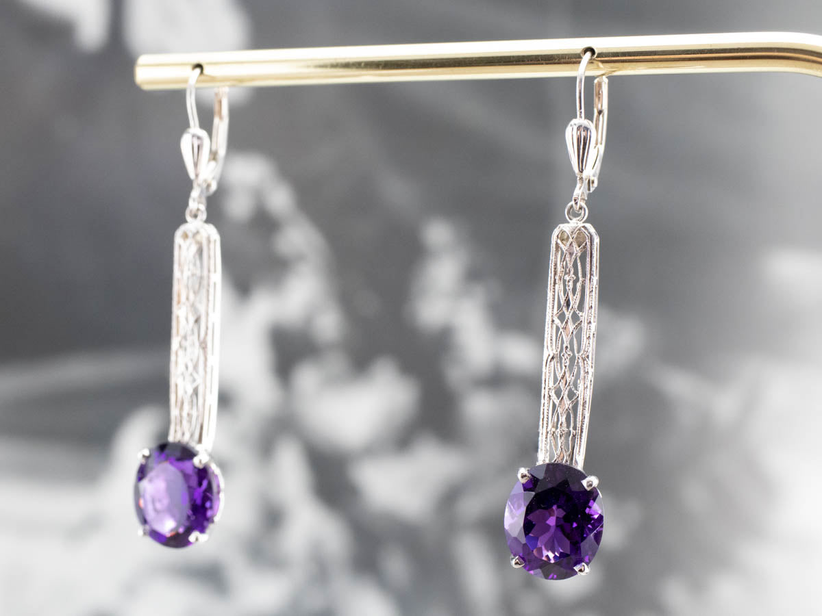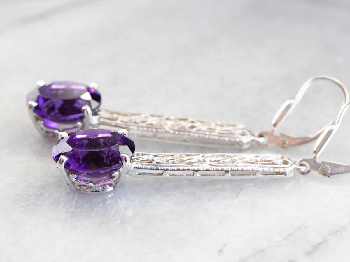 Audaces y profundamente saturadas, ¡estas gemas son preciosas! ¡El color es un morado intenso y verdadero con muchos destellos! La barra del centro es de oro blanco antiguo y de hermosa textura. Creamos estos aretes usando un pasador de barra de la época Art Déco.