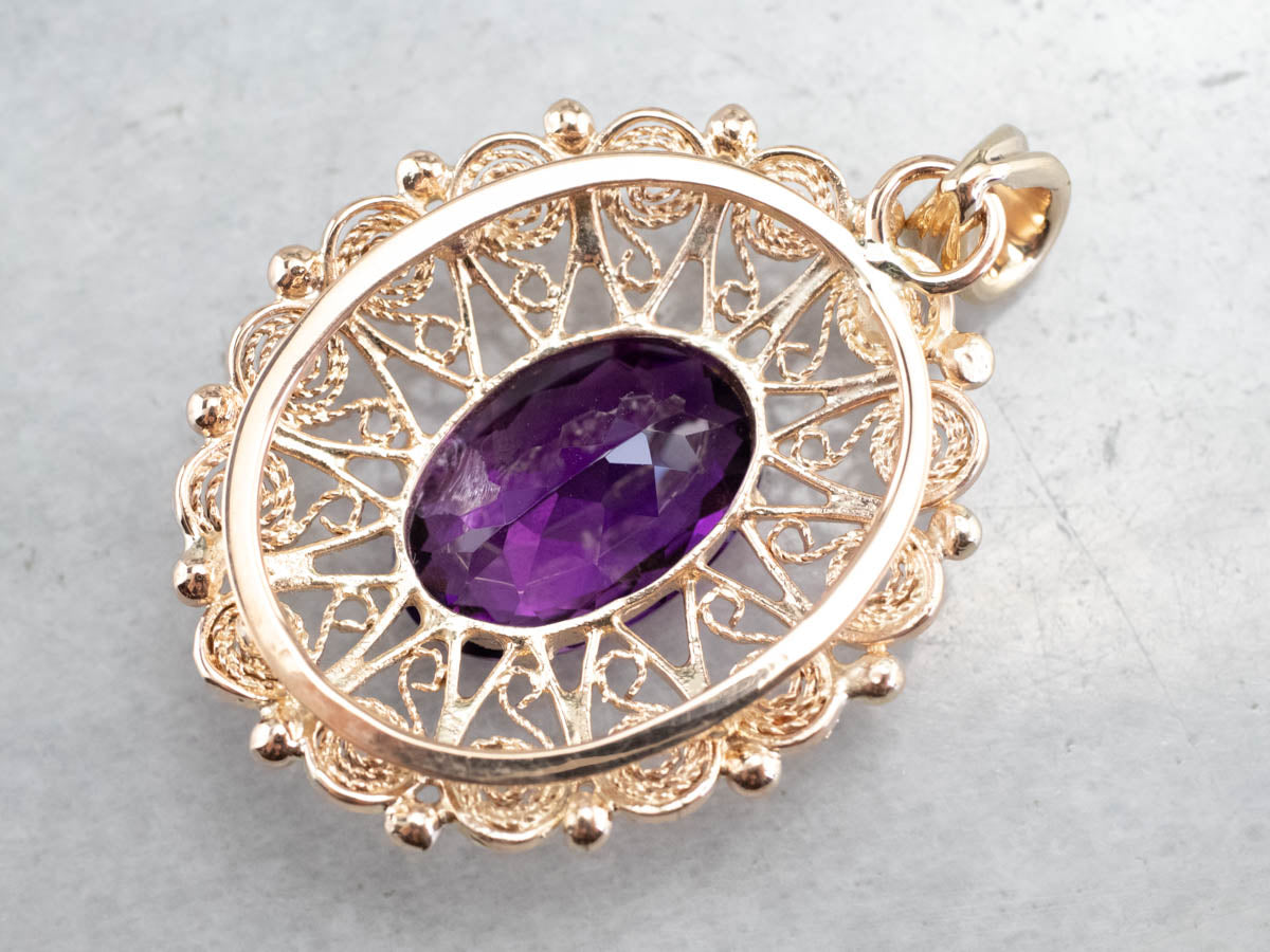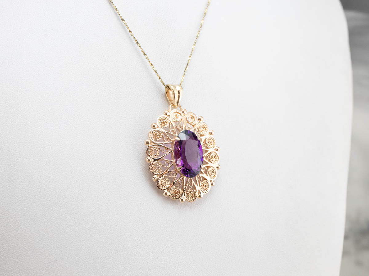 ¡Este colgante de amatista hace una verdadera declaración! Un marco de oro de 14 quilates con filigrana adornada es impresionante y llamativo, un marco digno para la joya excepcional en el centro. ¡Esta amatista tiene un rico tono de color púrpura intenso, con reflejos de violeta y lila!