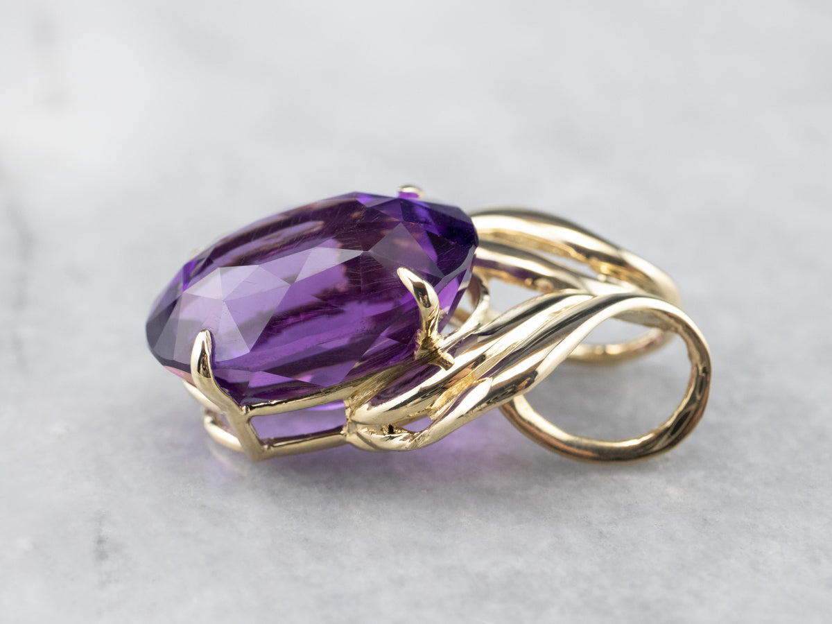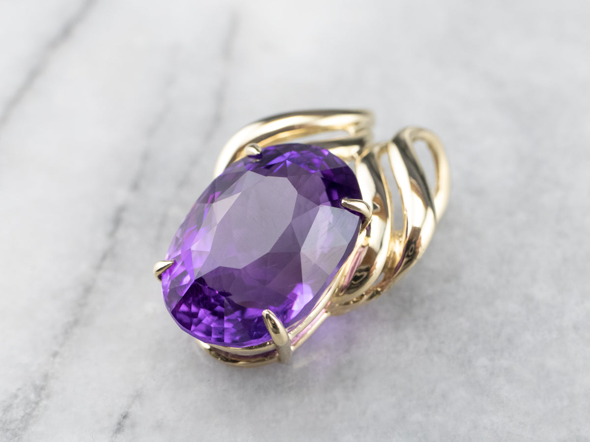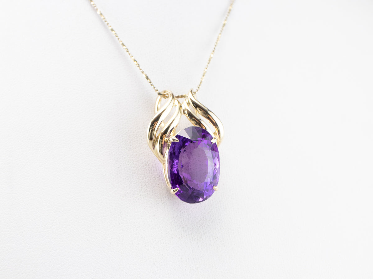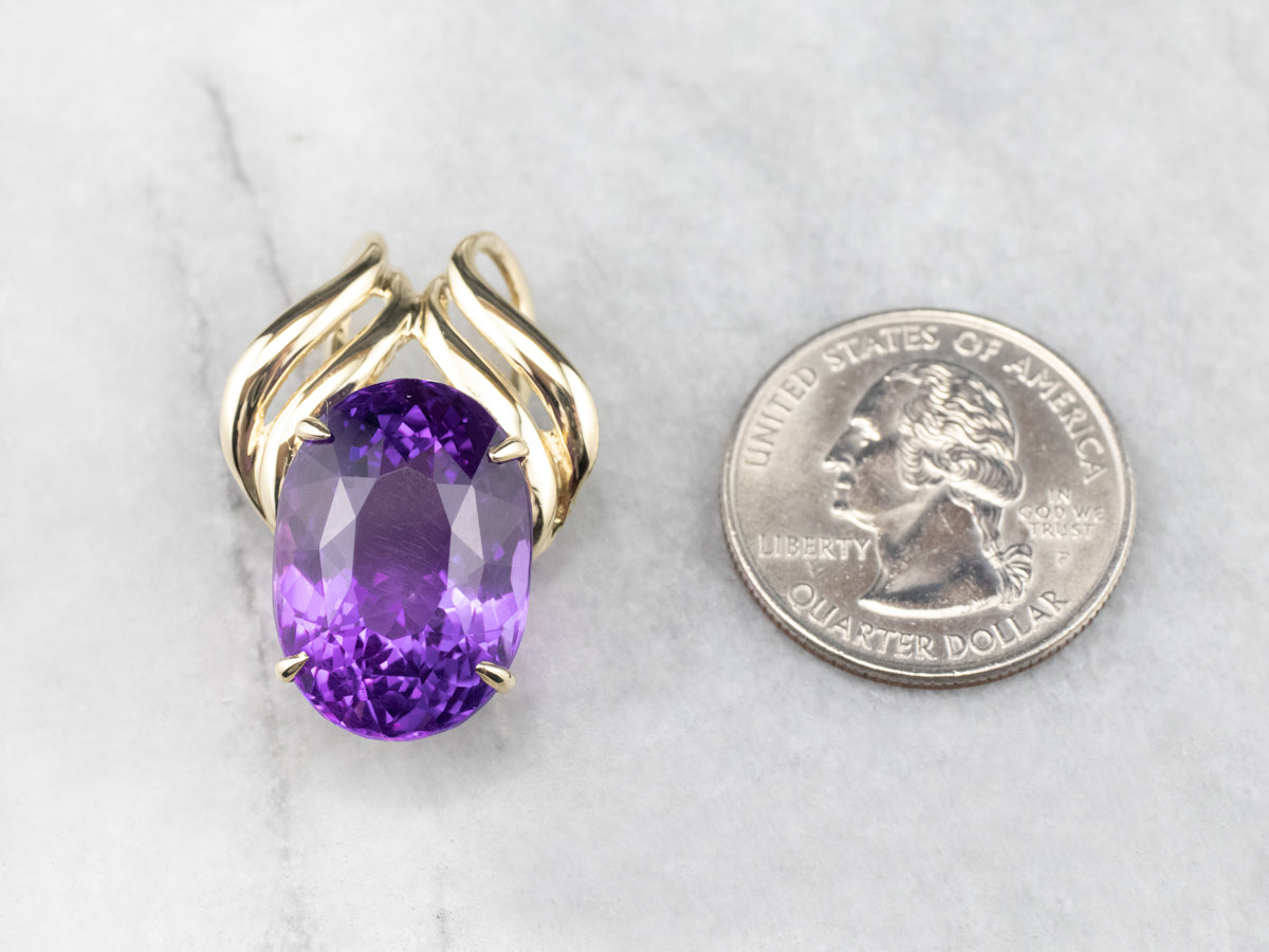 ¡Guau, qué piedra preciosa tan increíble! Esta amatista maravillosamente tallada pesa la friolera de 19,72 quilates, engastada en un engarce de oro amarillo altamente pulido. ¡Este colgante de cóctel se puede vestir de manera elegante o informal creando una declaración de color violeta visual!