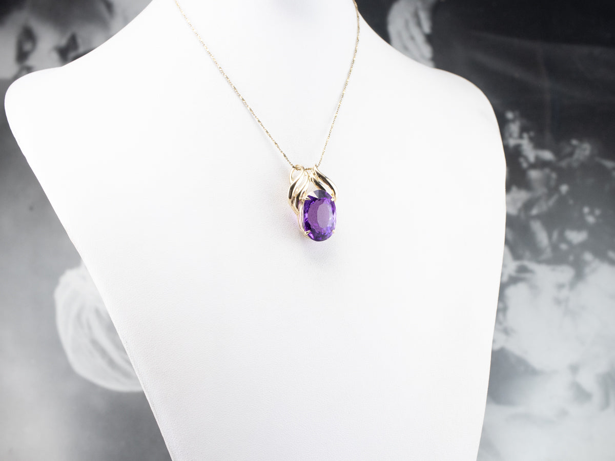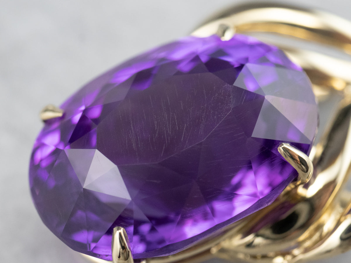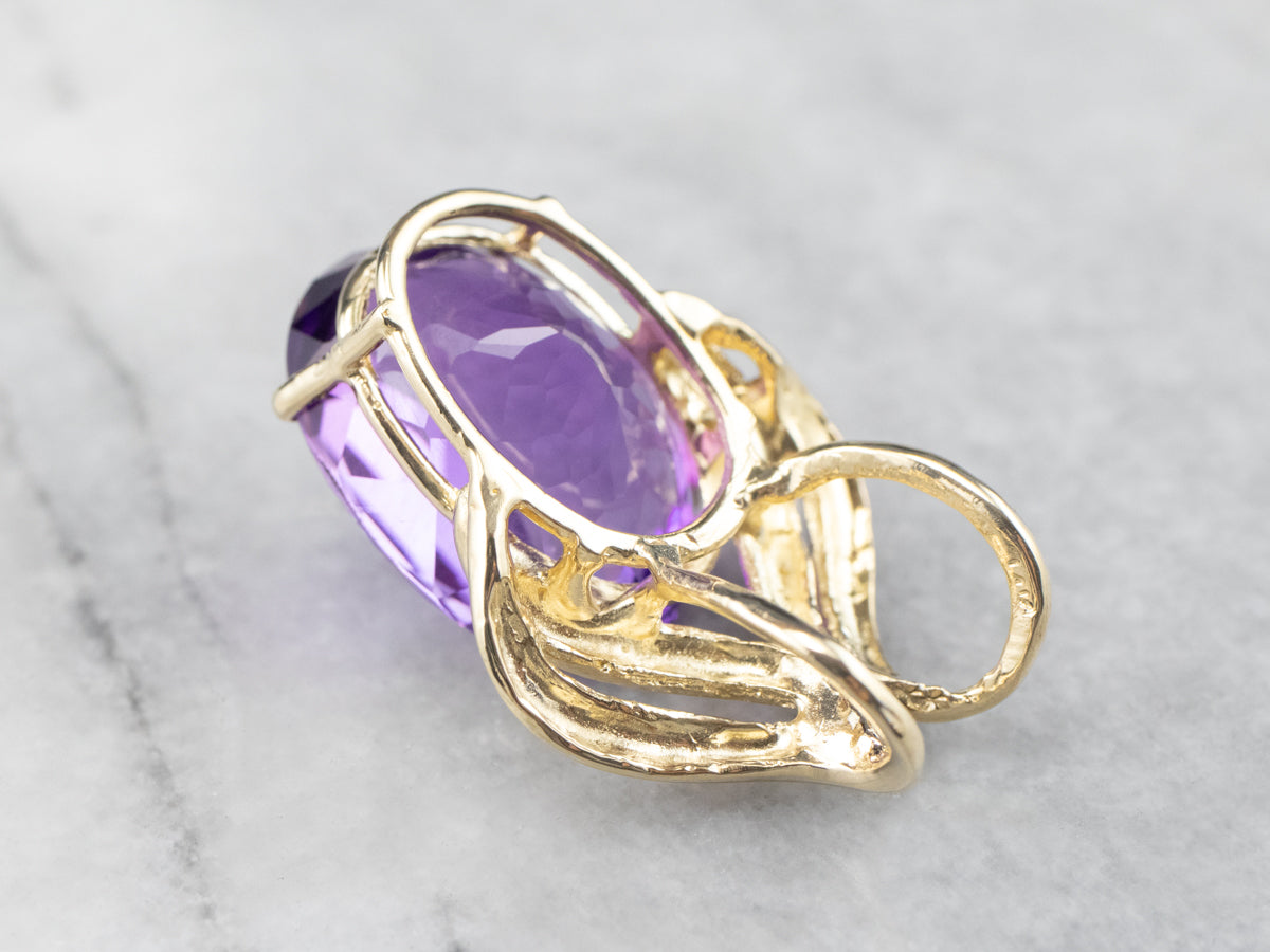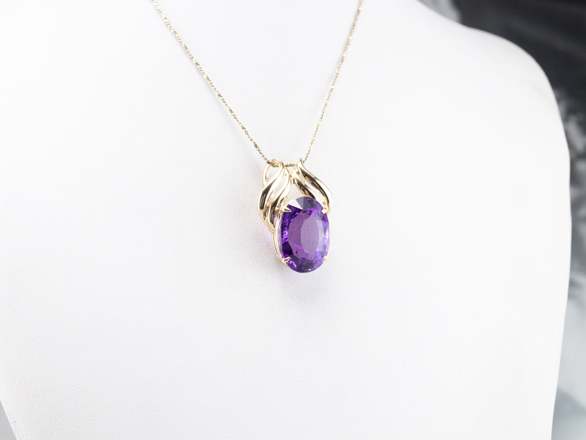 ¡Guau, qué piedra preciosa tan increíble! Esta amatista maravillosamente tallada pesa la friolera de 19,72 quilates, engastada en un engarce de oro amarillo altamente pulido. ¡Este colgante de cóctel se puede vestir de manera elegante o informal creando una declaración de color violeta visual!