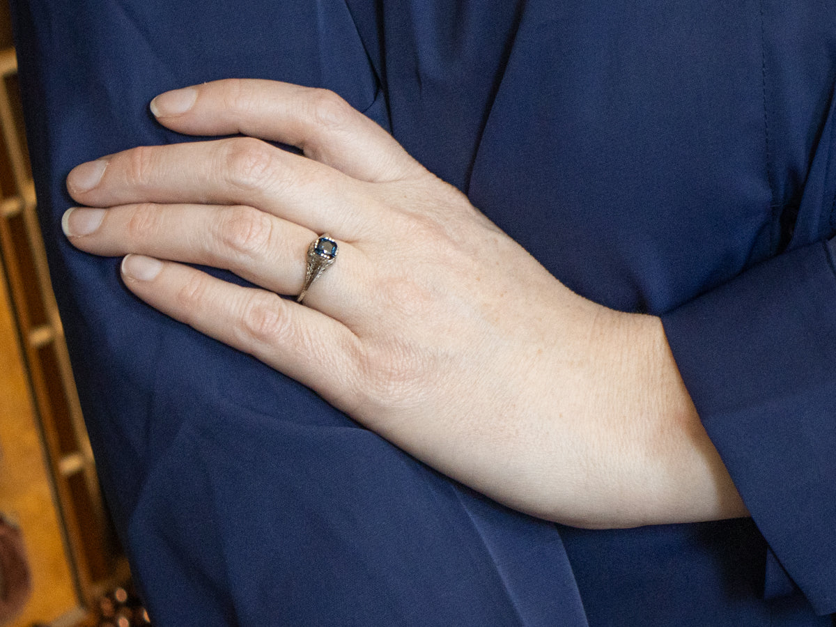 The Ostby and Barton company, established in 1879 in Providence, Rhode Island, by Englehart Cornelius Ostby and Nathan B. Barton, began with just $3,000 in capital. It grew to become the world’s largest ring manufacturer and one of the leading jewelry companies in the U.S., operating through the 1950s. This ring features a timeless 1920s design, beautifully newly set with a vibrant blue spinel, making it an exceptional piece for any antique jewelry collection.