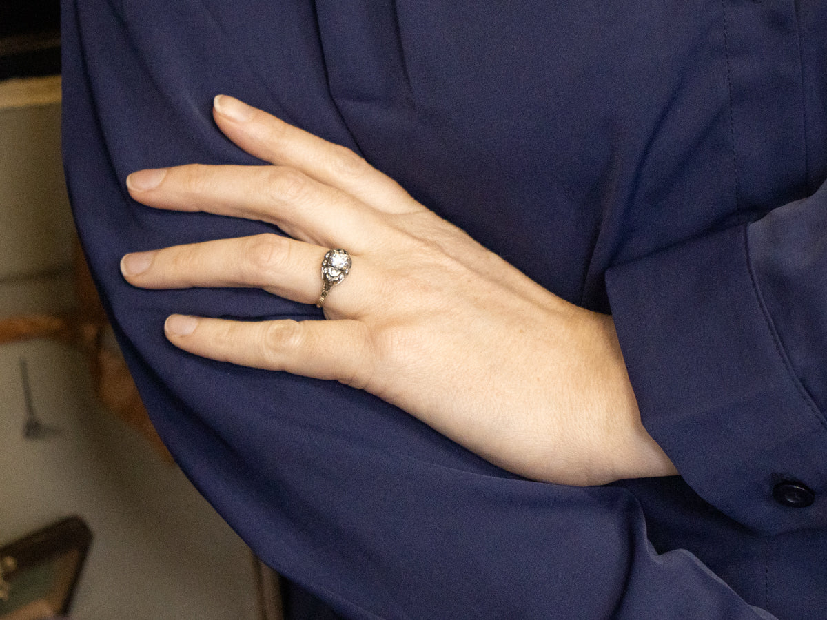 This is an exquisite diamond, a bright stone with big, luscious facets that reflect light throughout the entire European cut gem! Set into a late Art Deco diamond-encrusted mounting, the bright white 18-karat gold and handsomely engraved for substance and style with the maximum of security for this pretty diamond!