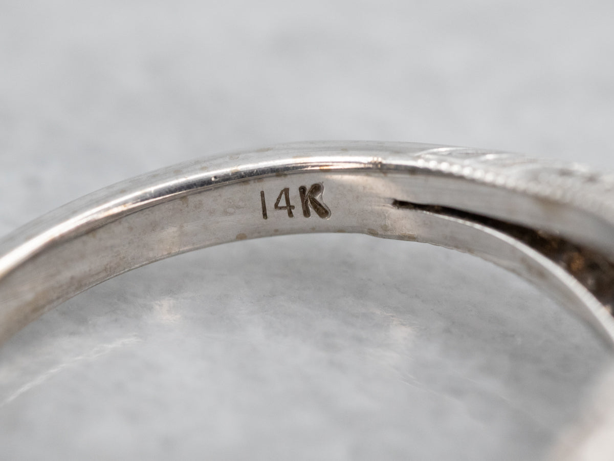 This beautiful mounting is done in the dazzling style of the 1920s and features scrolling white gold filigree throughout this stunning white gold mounting. This exquisite beauty is set with a round brilliant-cut diamond. Prong set into a protective white gold, this stone is secure, sparkling, and stunning!