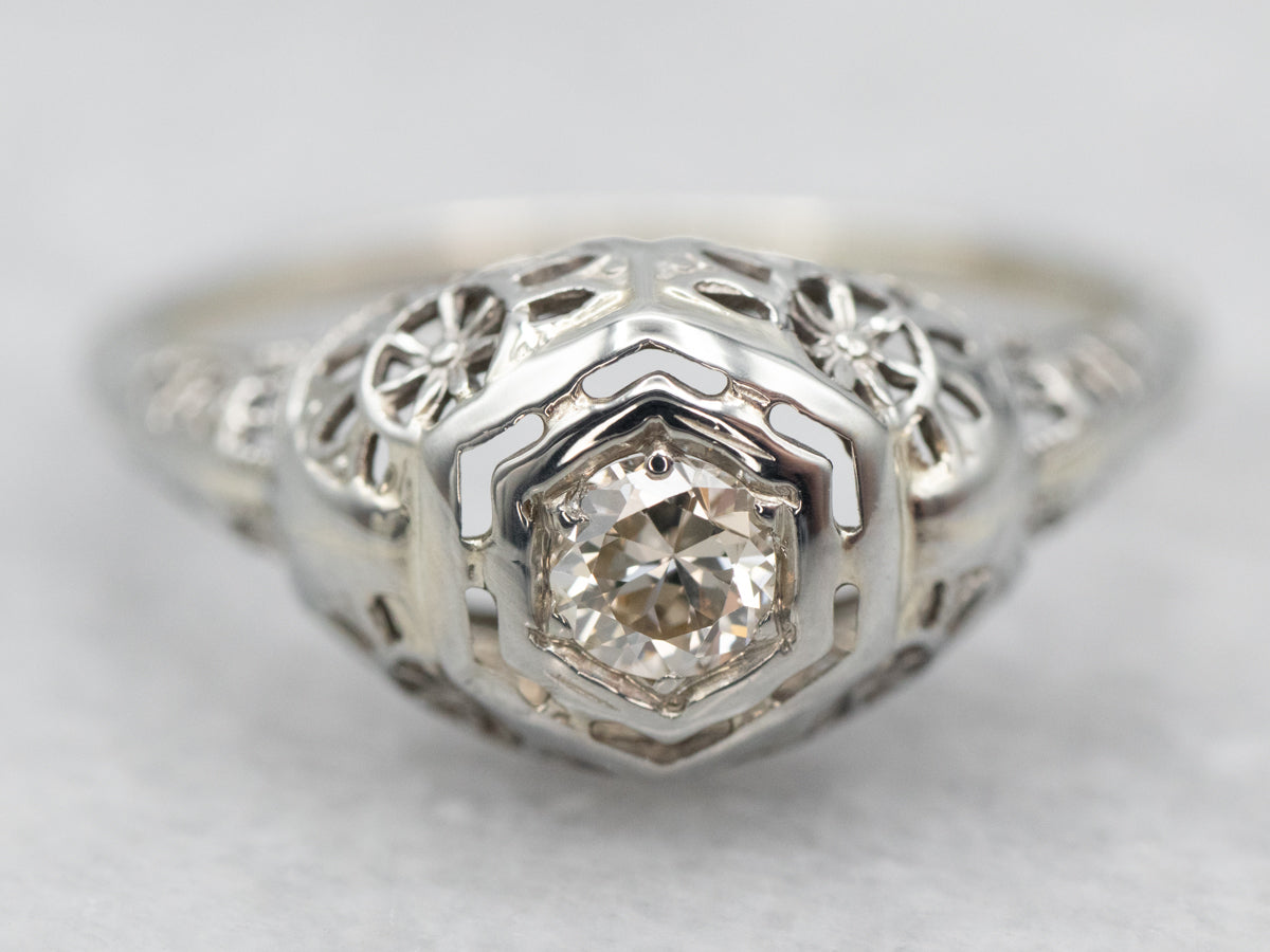 Este clásico anillo Art Déco es una adición icónica a cualquier joya. Con una reluciente banda de oro blanco y un exquisito engaste de diamantes de talla europea, esta impresionante pieza ofrece una opulencia sutil para el uso diario o un evento especial.