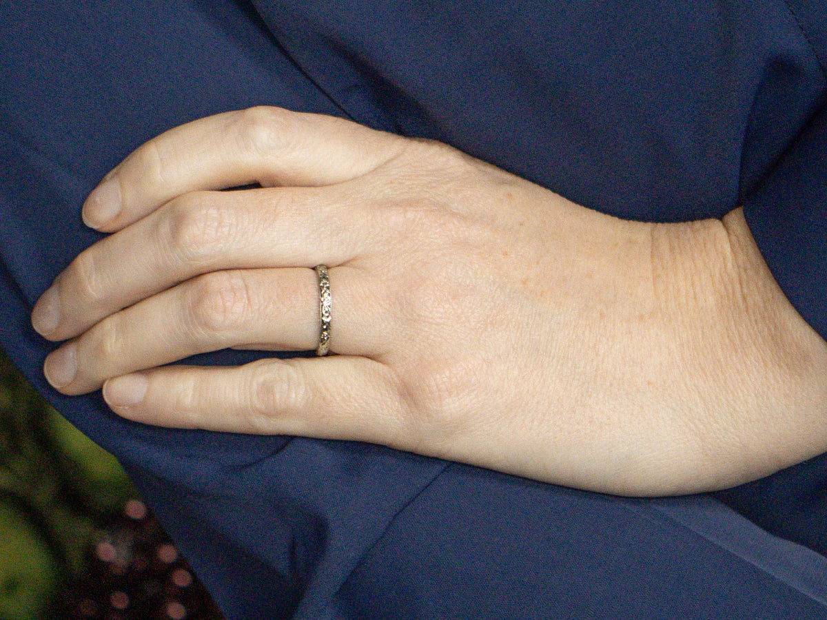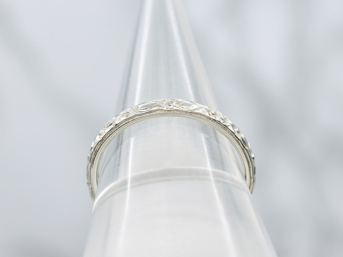 This exquisite white gold band showcases the refined craftsmanship of 1929, featuring an intricate floral pattern that exemplifies Art Deco elegance. The delicate design work reflects the artistry of the era, making it a distinguished choice for those who appreciate vintage jewelry with historical significance. A timeless piece that seamlessly complements both classic and contemporary styles.