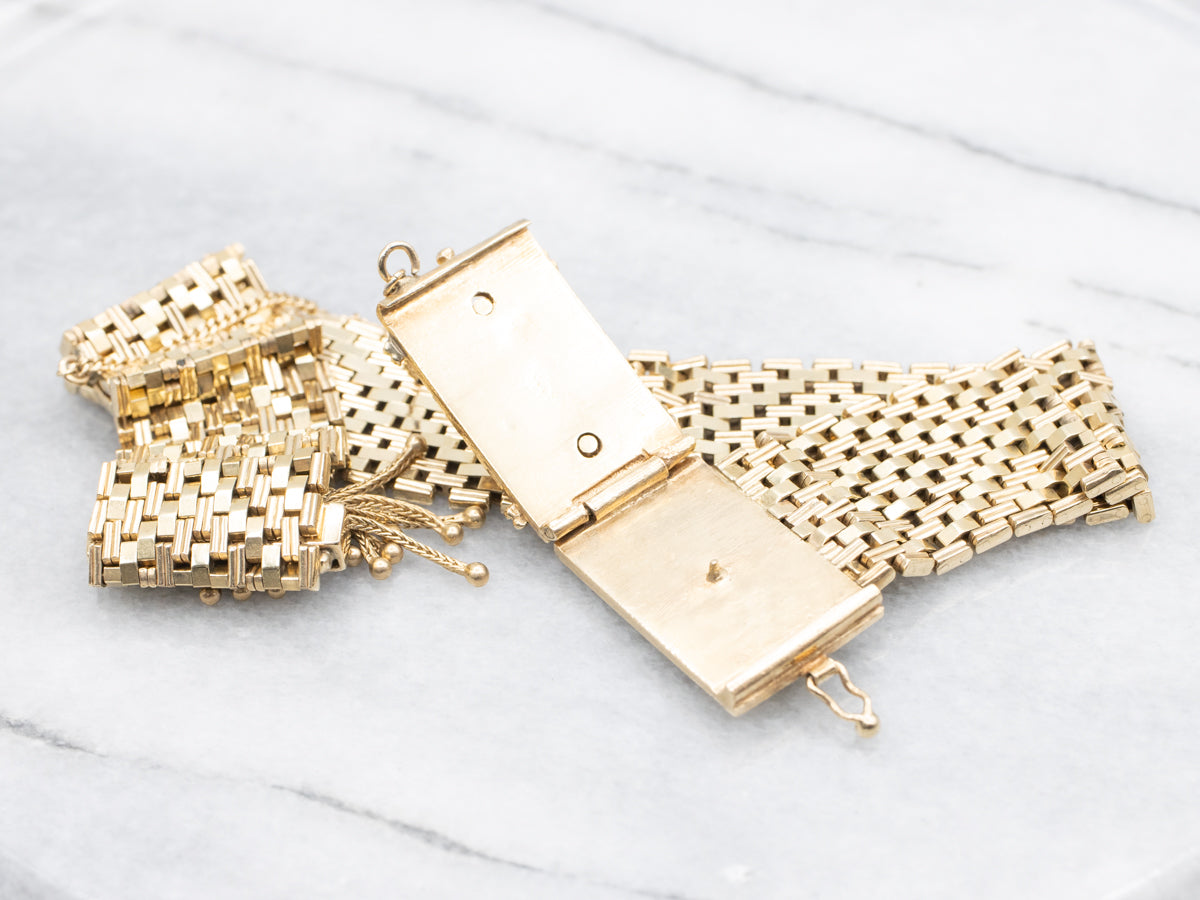 Brazalete de malla estilo victoriano de mediados de siglo de oro amarillo de 14 k con eslabones grabados y facetados y diseño ornamentado, cierre plegable con filigrana abierta sobre detalles en esmalte azul y engaste de puntas, piedra central redonda de perla con detalles de esmalte azul, extremo ajustable y borlas de cadena de cola de zorra con extensión de cadena de acera.