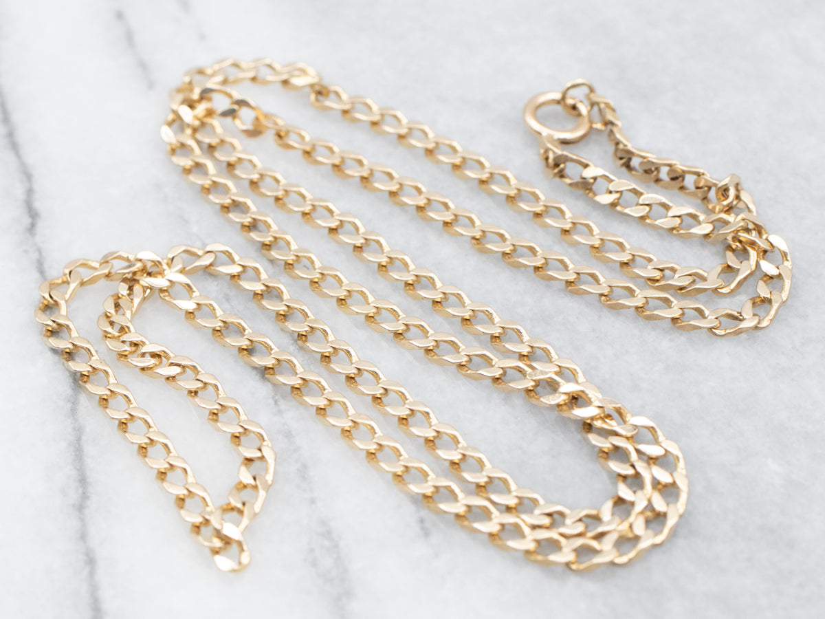 This curb chain is designed to lay flat and comfortably against the neckline when worn. Made of 14-karat gold, this necklace has a lovely polish and will be a versatile addition to any collection!