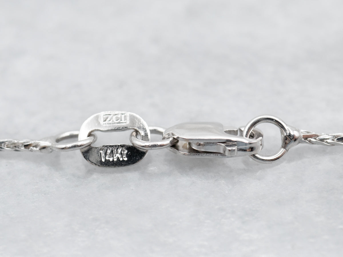Esta cadena altamente pulida está en excelentes condiciones y es una pieza que será útil y se usará con frecuencia en los años venideros. Sería fácil de usar con un colgante, ¡pero ciertamente es bastante bonito por sí solo! Elaborada en oro blanco, esta cadena de trigo tejida tiene una superficie ligeramente texturizada que parece un trozo de trigo (¡de ahí el nombre!), pero también le da un gran brillo y un juego de luces contra la piel.