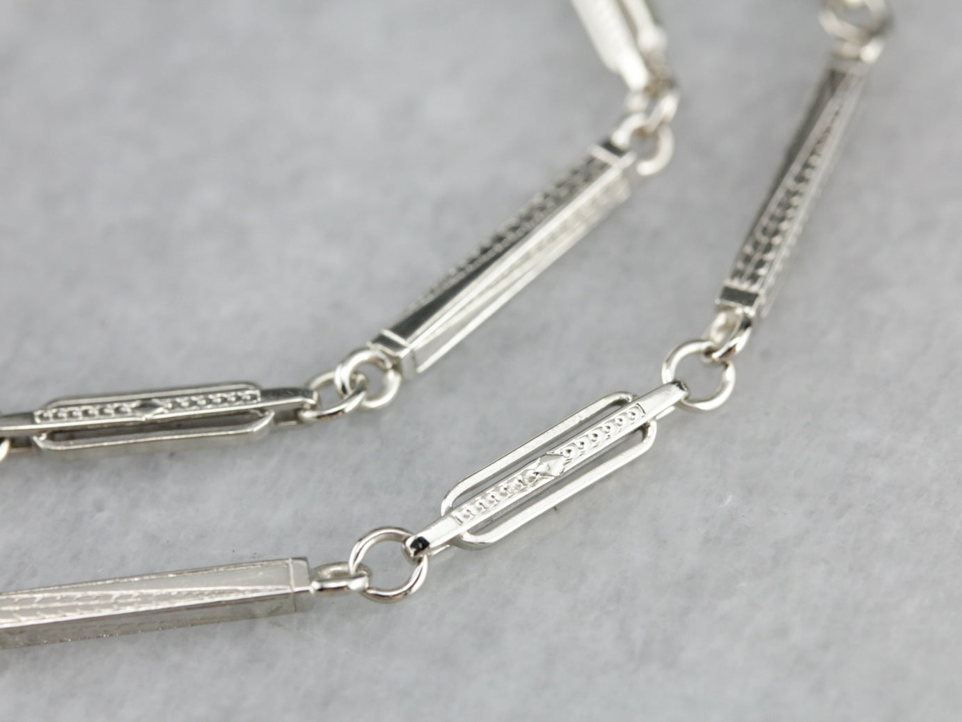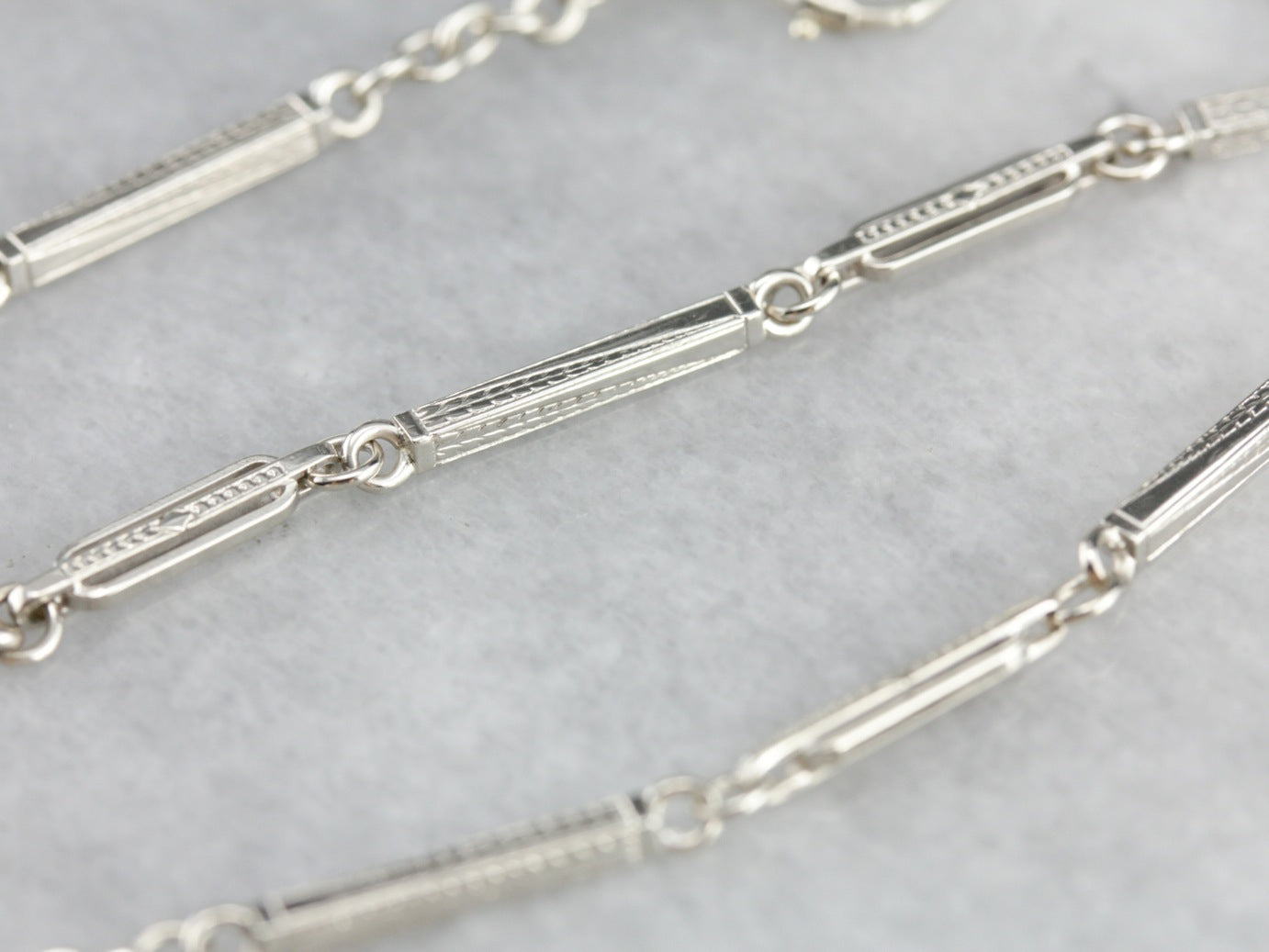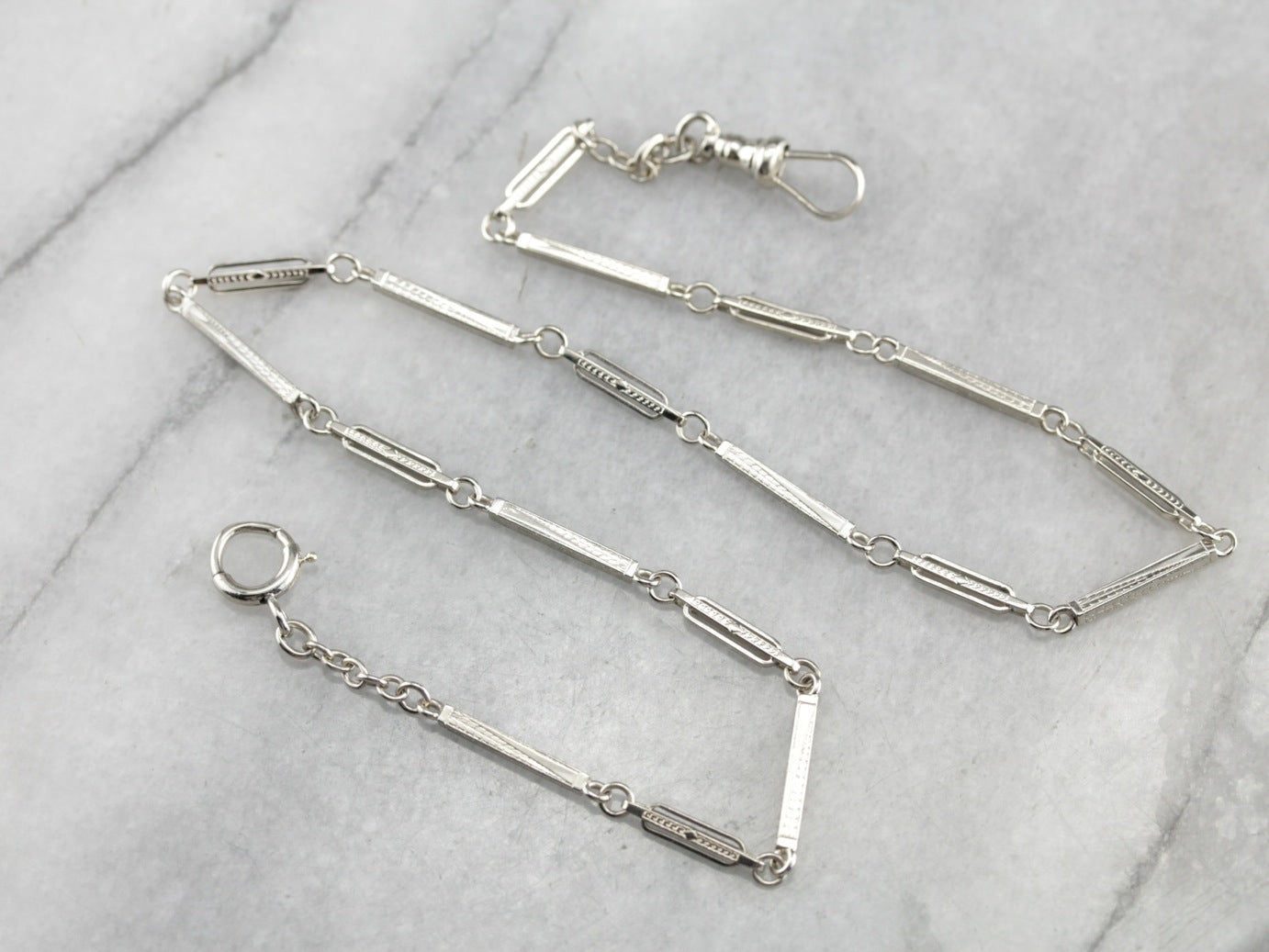 Esta cadena antigua está en perfecto estado, con eslabones de barra grabados y cierres que se mueven suavemente. La artesanía es magnífica y cada pieza forma una pequeña obra de arte. Con 13 1/2 pulgadas, esta pieza sería un buen extensor para otra cadena, o incluso una pulsera enrollada dos veces, cuando no se use como cadena de reloj.