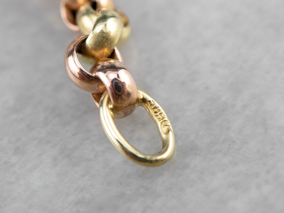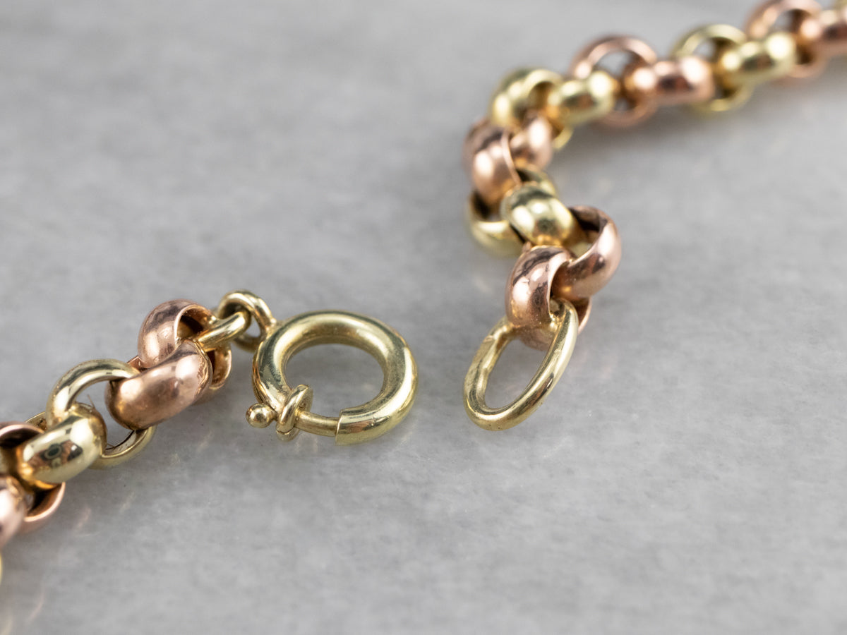 ¡Esta cadena rolo graduada hace una hermosa declaración! Dos tonos de oro de 14k forman una sorprendente combinación en fuertes eslabones que brillan a la perfección. ¡Esta es una pieza versátil y elegante!