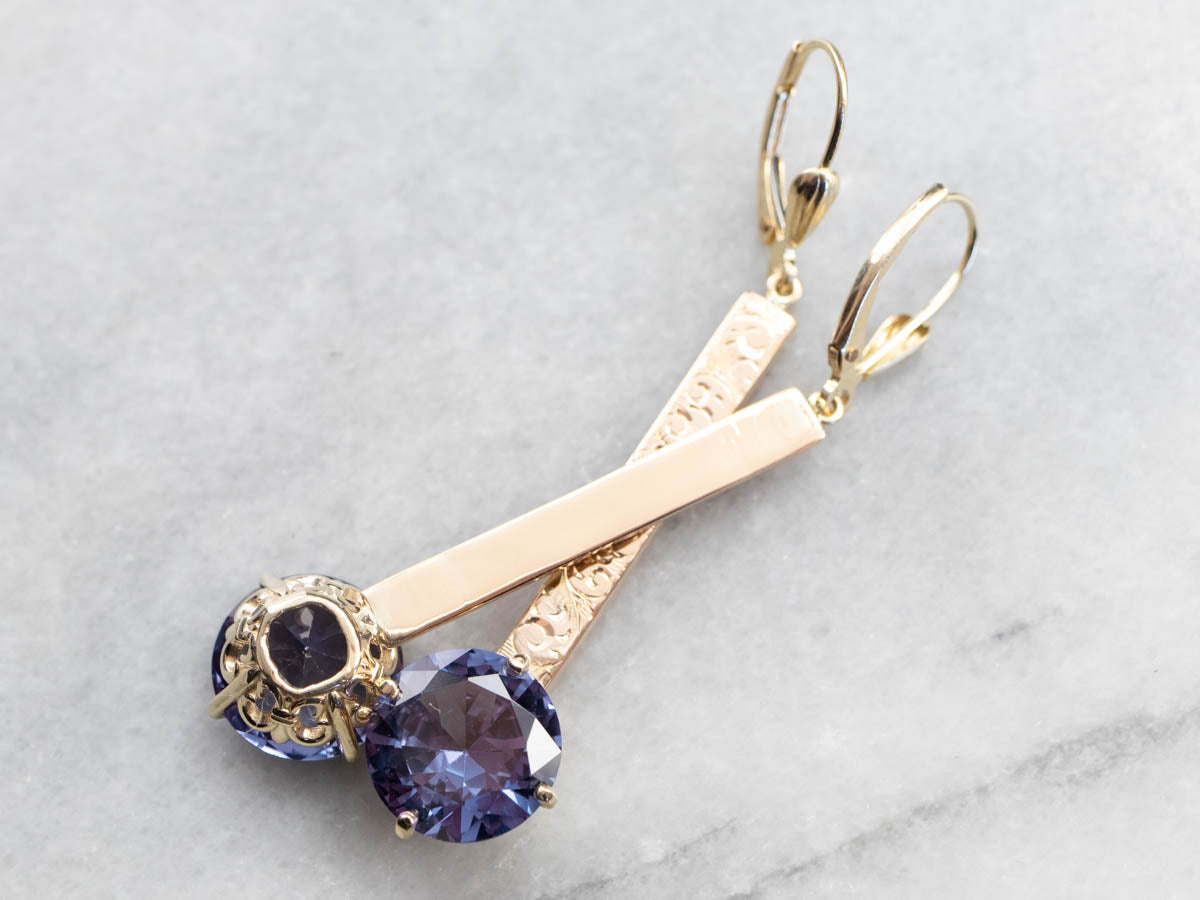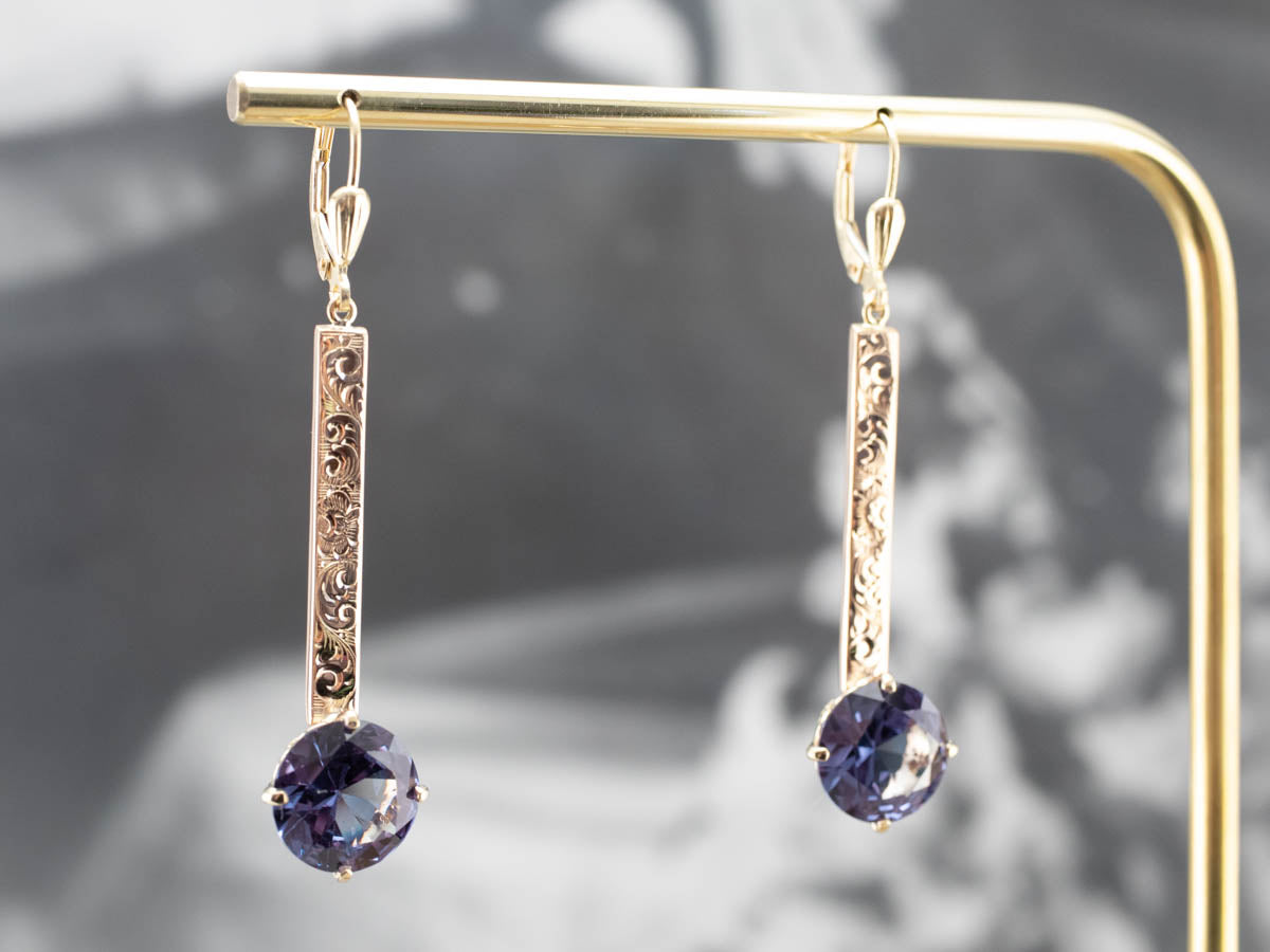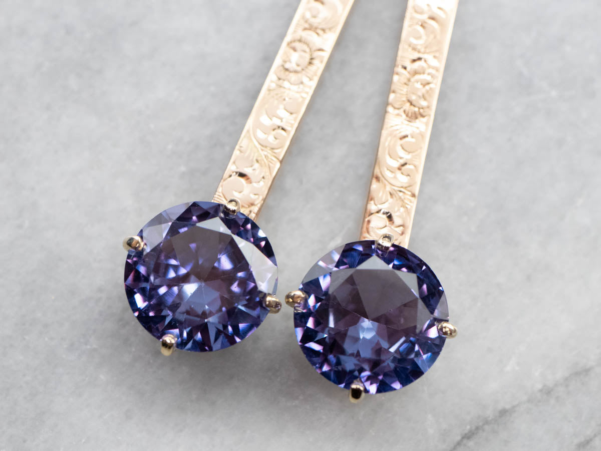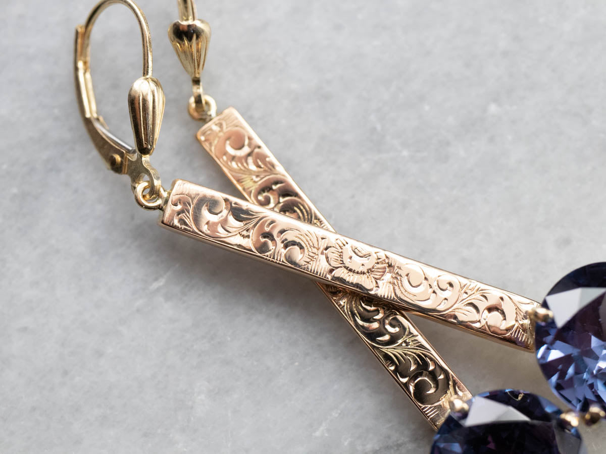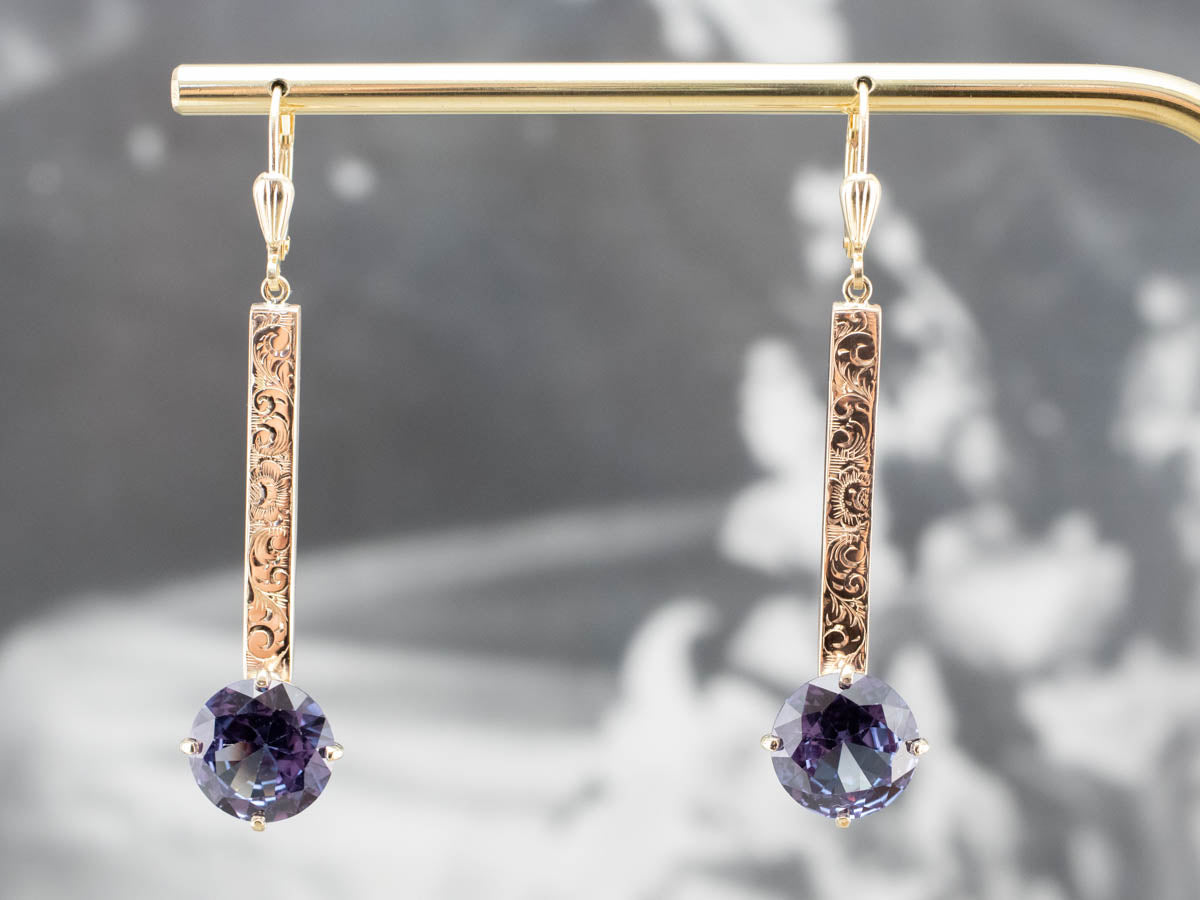 ¡Romántico y elegante! Estos aretes colgantes, únicos en su tipo, cuentan con barras de oro rosa antiguas reutilizadas grabadas. Una cabeza pulida de filigrana se combina con cuatro puntas estructurales para sostener una hermosa piedra central de alejandrita sintética. Las puntas aseguran y enmarcan la piedra, dejando pasar mucha luz. La alejandrita sintética es una piedra que cambia de color y reflejará tonos de púrpura majestuoso a verde azulado dependiendo de la luz que incide sobre la piedra.