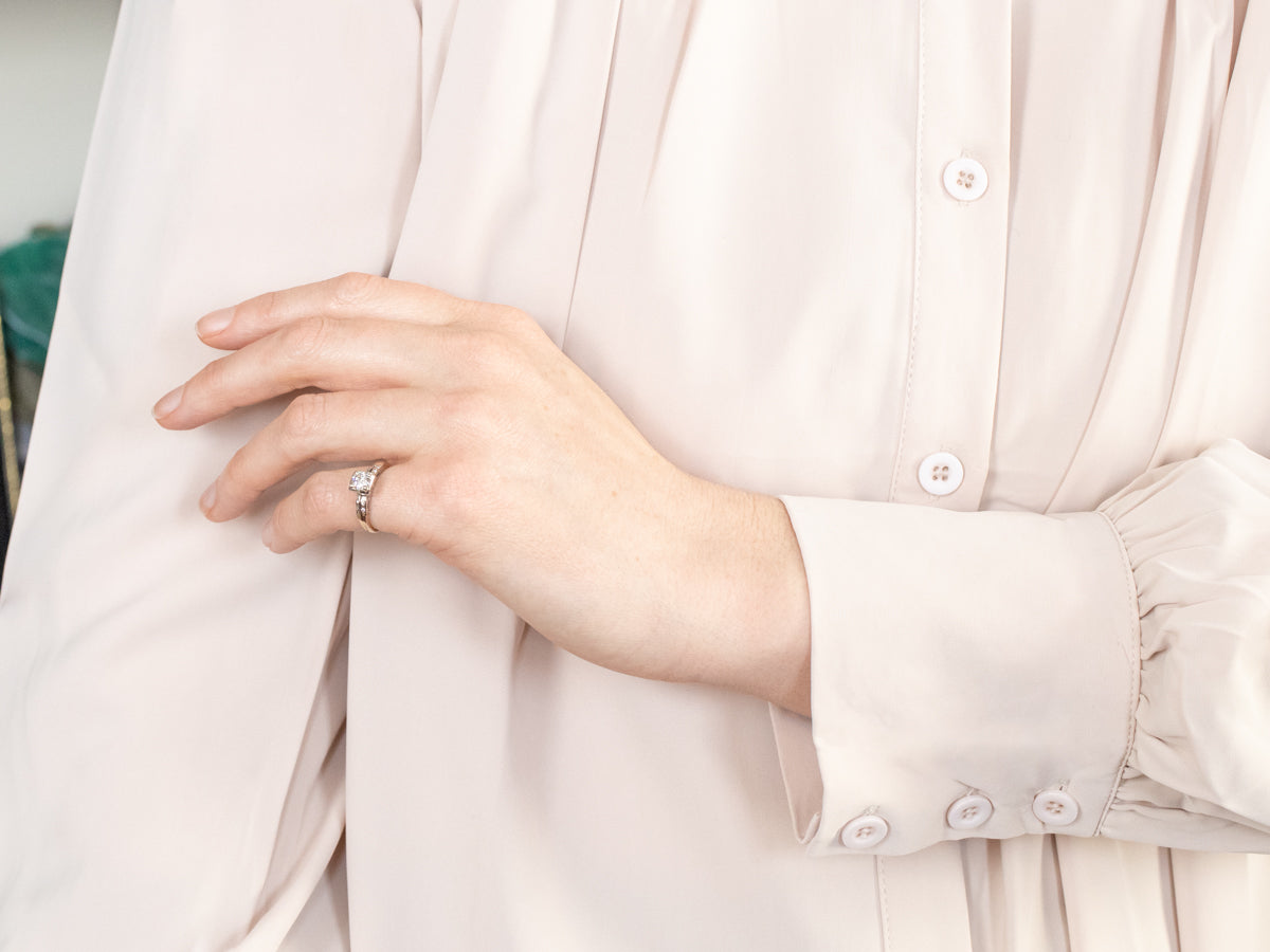 This vintage diamond engagement ring has wonderful small details that complement its overall structural feel. The shoulders are set with sparkling diamonds. This 14-karat white gold head and shoulders do double duty, both providing an illusion of larger diamonds and holding it securely in place. Feminine yet sophisticated, this will make a lovely heirloom place for years to come.