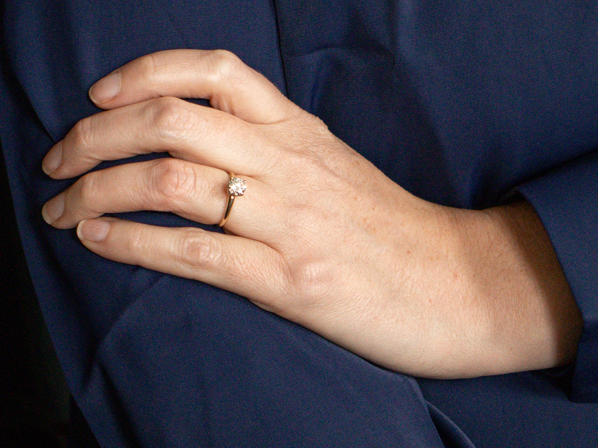 This engagement ring is simple and traditional, with a gently tapered shank and shoulders, and a perfectly balanced silhouette. A lovely, low-set head holds the diamond and gently transitions into a sleek and beautifully polished yellow-gold shank. Timeless and elegant!