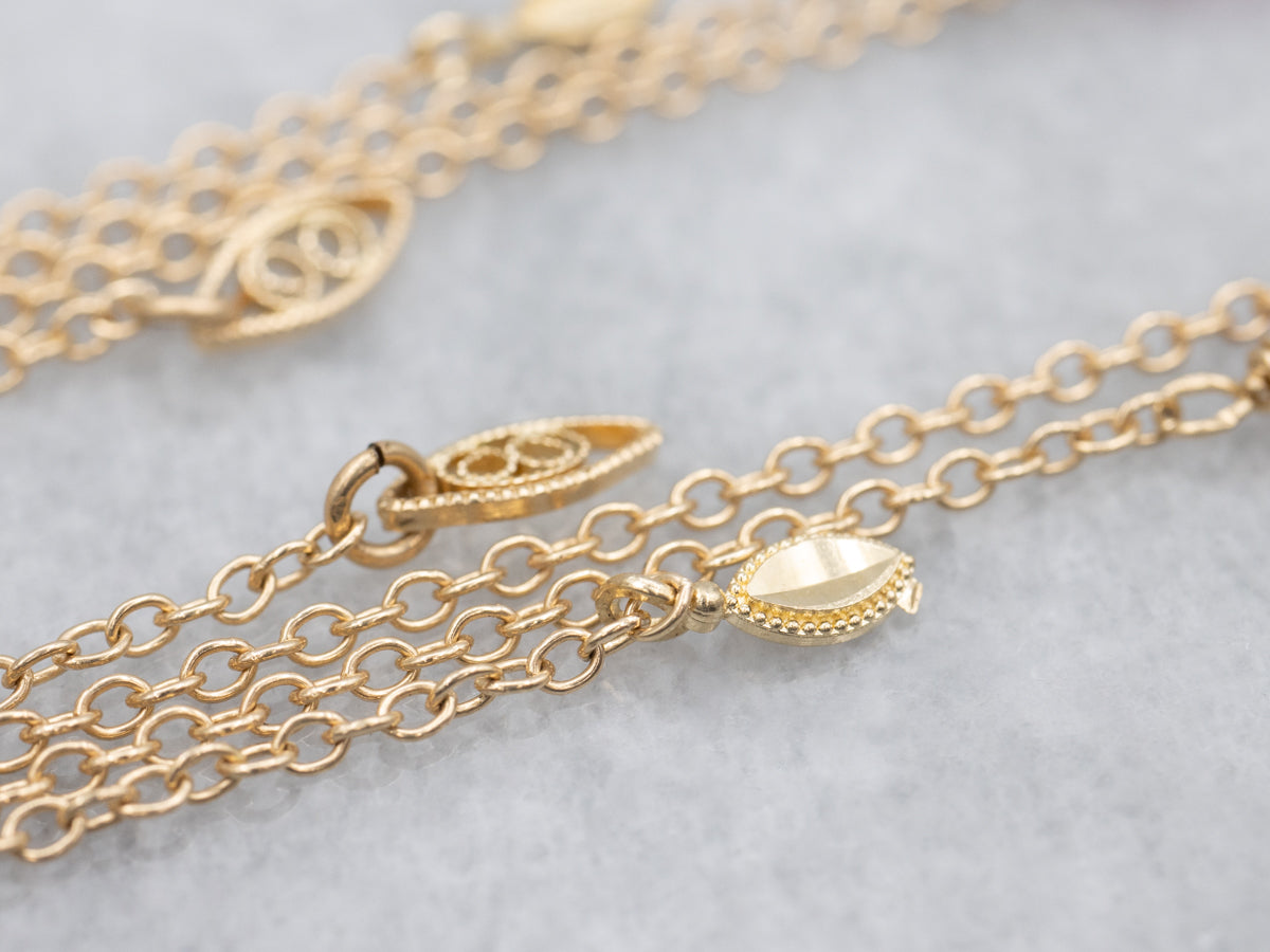 These charming drop earrings are made of yellow gold and showcase dazzling briolette cut pink tourmaline stones. The delicate chain tassels add a playful touch, making them the perfect sparkling accessory to brighten up any look!