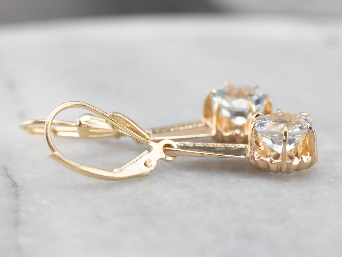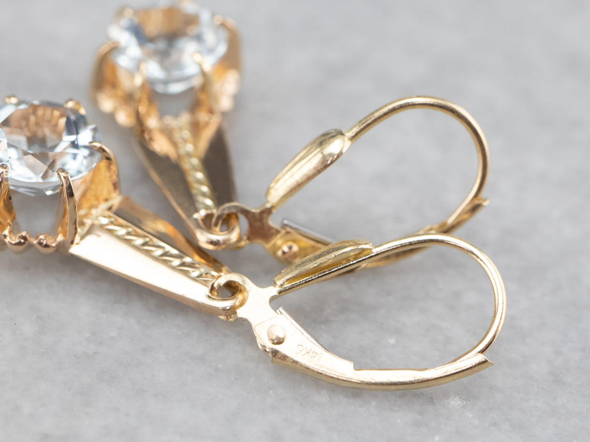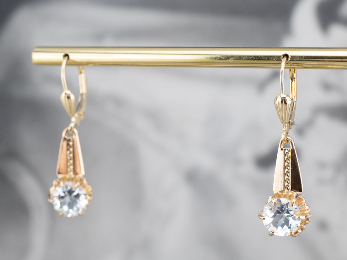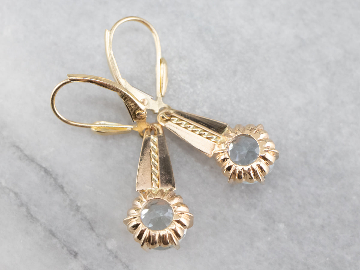 Hemos engarzado estas gemas en cabezas de botón de oro amarillo, rematadas con piezas de oro retorcidas de un broche antiguo. Los alambres de los aretes son de cierre de palanca seguro y están elaborados en oro amarillo de 14 quilates.