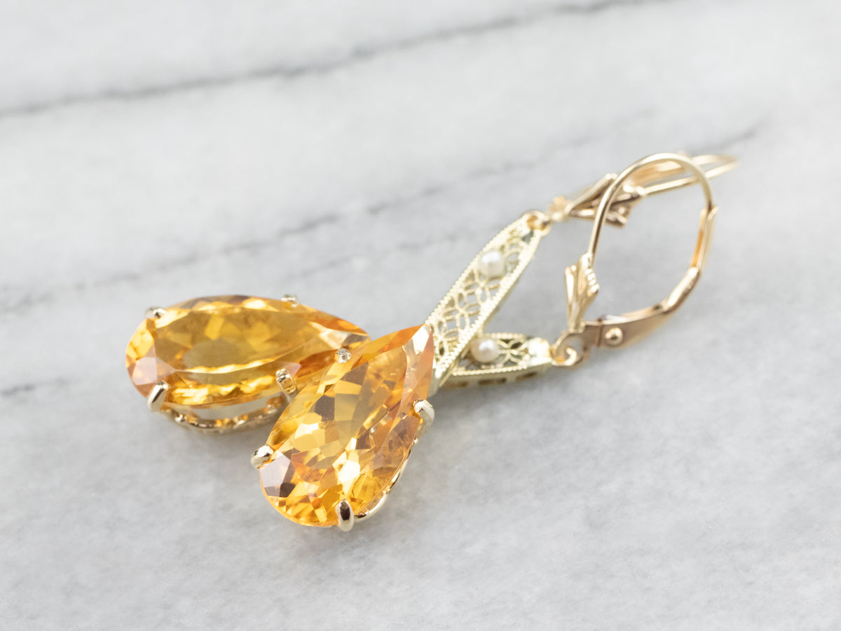 These are the gorgeous earrings you've been looking for! Sunny citrine gemstones adorn these handcrafted earrings that we've reimagined from a vintage bar pin. Seed pearls and gold filigree details add elegance and charm to these earrings, the perfect addition to your evening out!