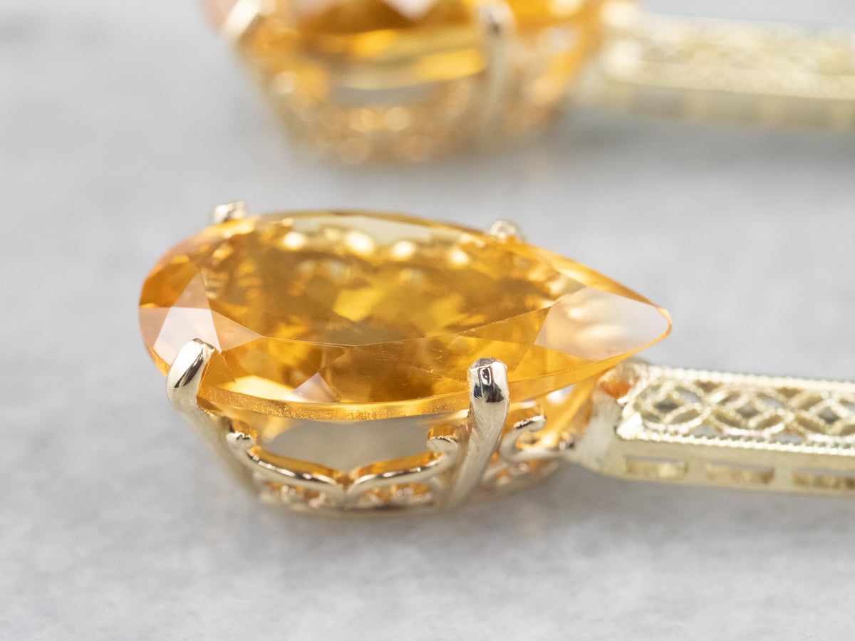 Pear Cut Citrine Gold Filigree Bar Drop Earrings