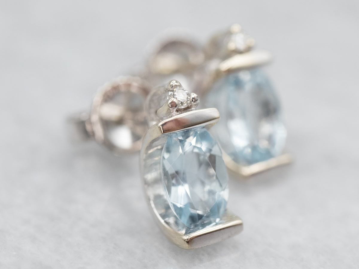 ¡El engaste de estos pendientes es muy interesante! La forma de media luna mantiene el topacio azul de talla ovalada firmemente en su lugar, con un único diamante adornando la parte superior. Listos para lucir elegante o informal, estos aretes seguramente serán un elemento básico de su colección.