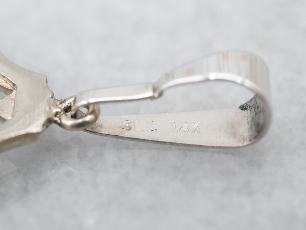 This timeless Art Deco filigree pendant is crafted from white gold and features a dazzling diamond accent. With its delicate detailing, it’s a luxurious piece that will stand the test of time.