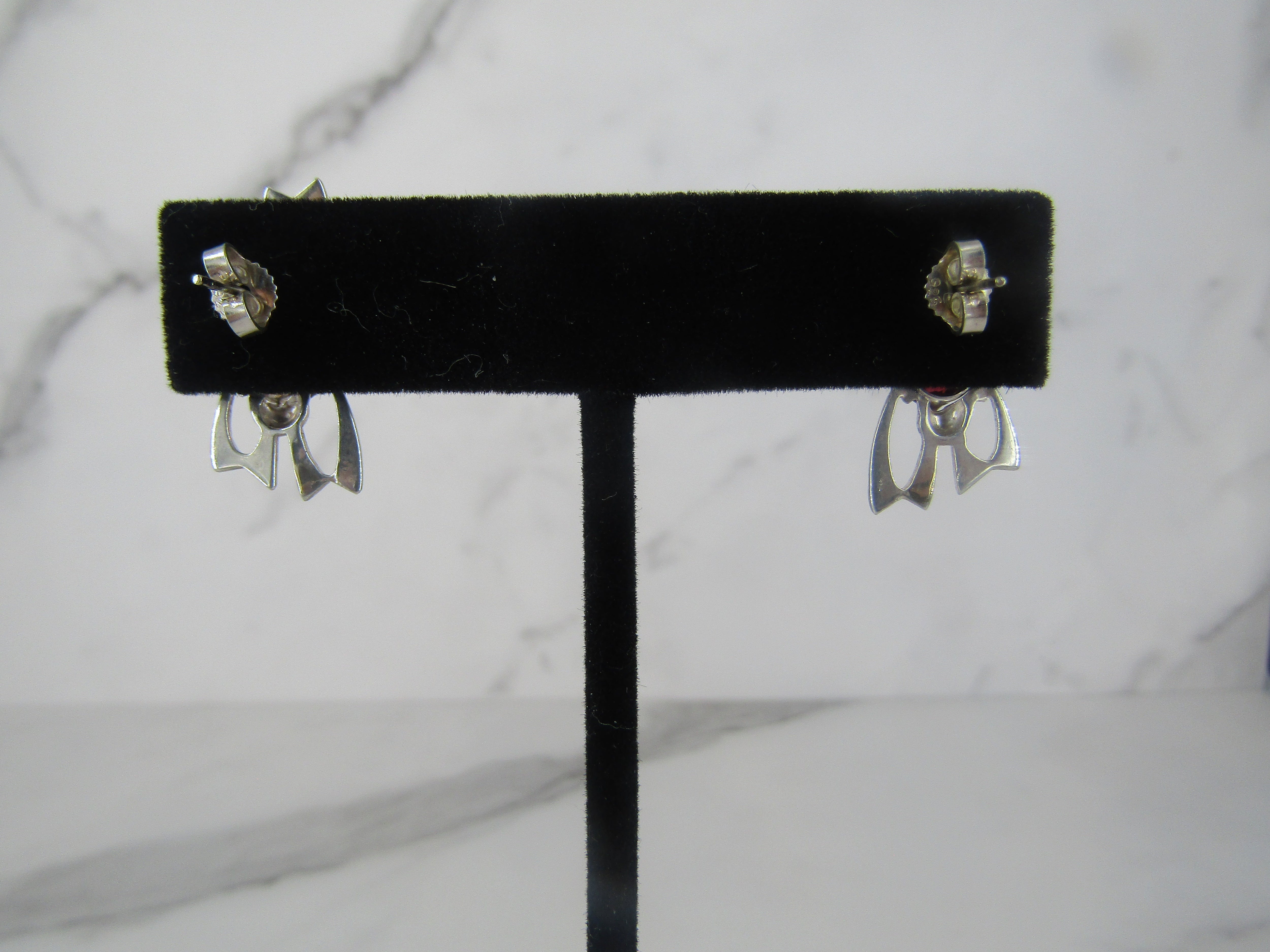 Sterling Silver, gold open work stud earrings with faceted garnet oval center and post backing.