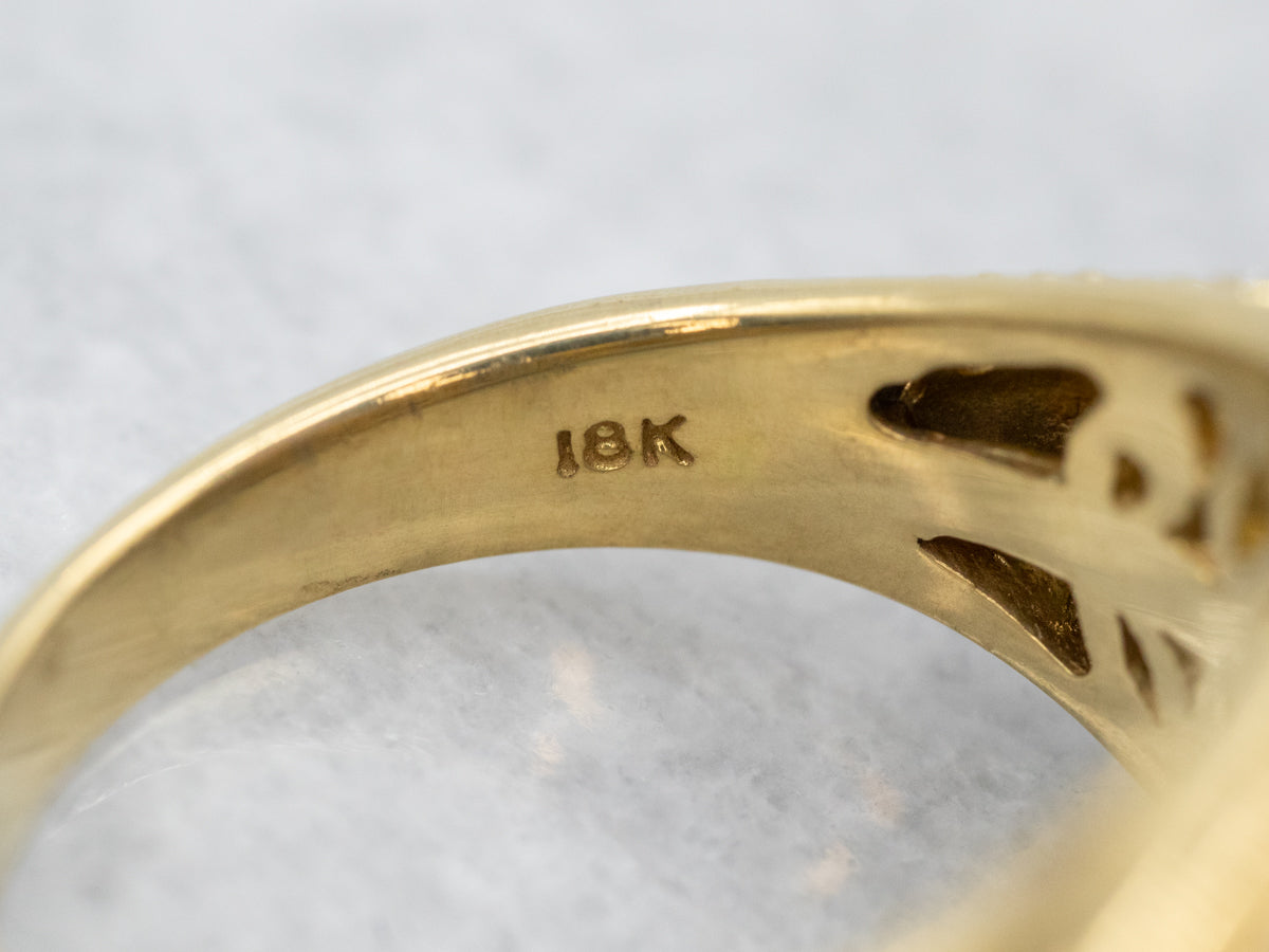 This polished gold east-to-west set cocktail ring is bold and fabulous! The wide shoulders feature scrolling filigree, encrusted with sparkling diamonds. At the center is a large, deep red garnet, flashing with tones of crimson. This is a statement piece that is sure to grab attention!