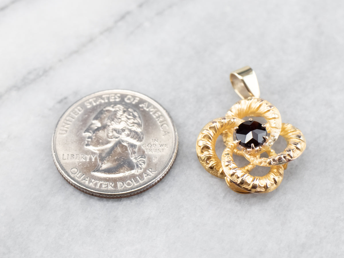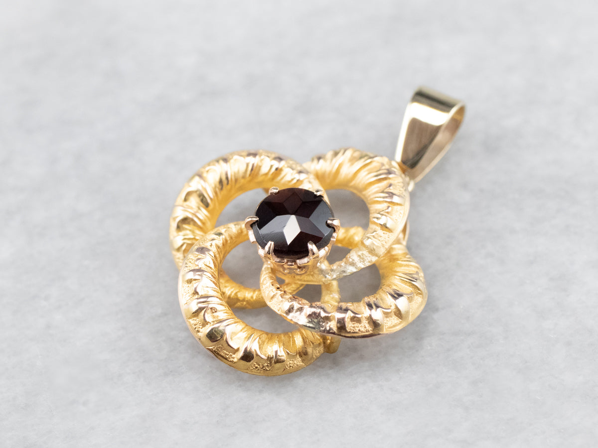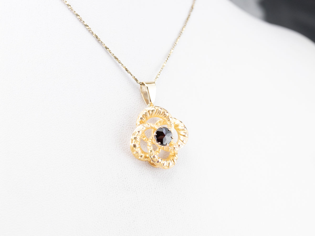 Un granate de color rojo sangre intenso está perfectamente centrado dentro de este ornamentado colgante de nudo de oro amarillo. Perfecto para todos los días, ¡esto también sería una hermosa pieza de aniversario!