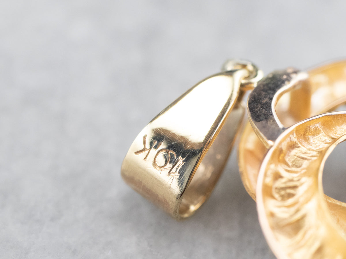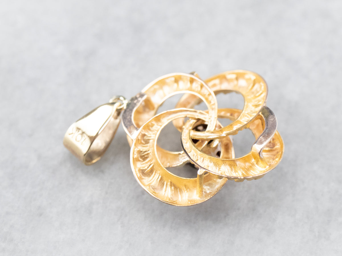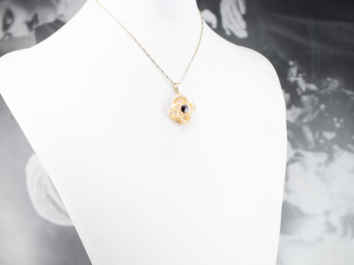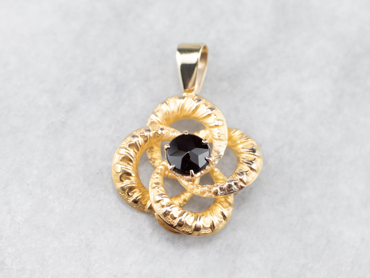 Un granate de color rojo sangre intenso está perfectamente centrado dentro de este ornamentado colgante de nudo de oro amarillo. Perfecto para todos los días, ¡esto también sería una hermosa pieza de aniversario!