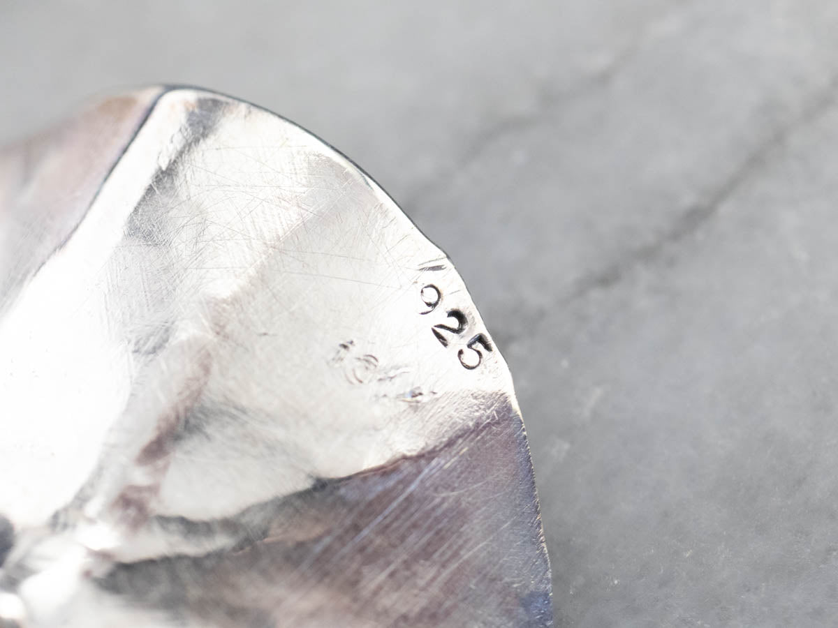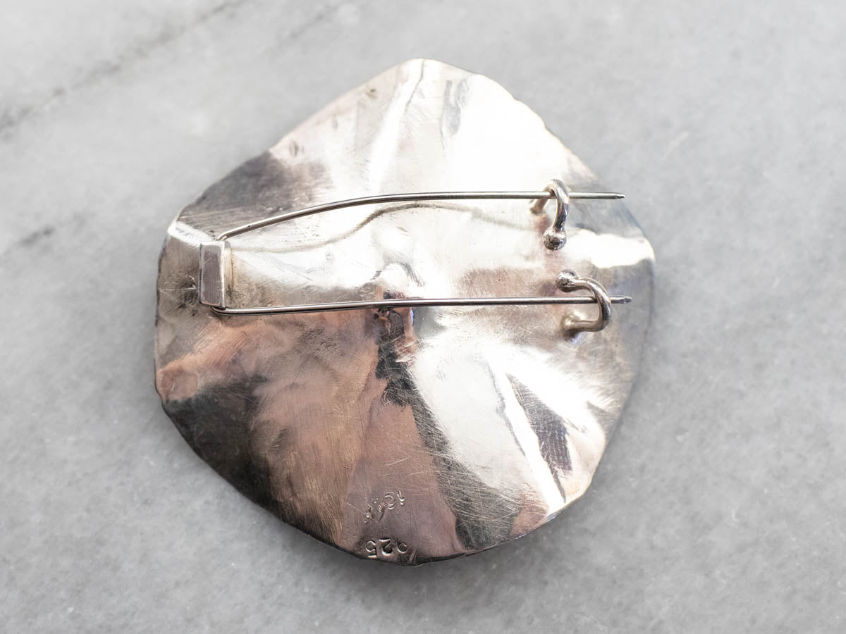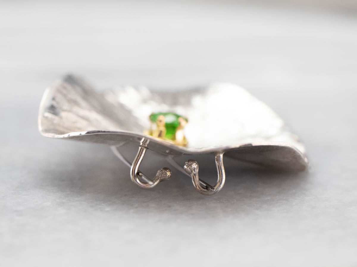 ¡Orgánico y contemporáneo! Este broche está hecho a mano en plata de ley y oro amarillo de 10 quilates, engastado con un único granate verde brillante. ¡Un tamaño fantástico para usar en una blusa, bolso, bufanda o chaqueta, esta pieza pulida está lista para usar o regalar!