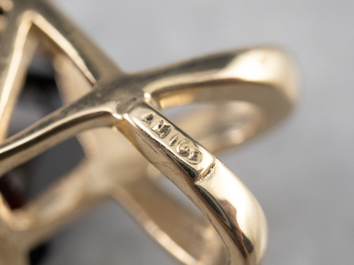 This is a simple and timeless piece. A large cushion cut, dark red garnet is the focus, accented with rich gold prongs that contrast beautifully. Perfect for everyday wear, this would make a lovely anniversary piece!
