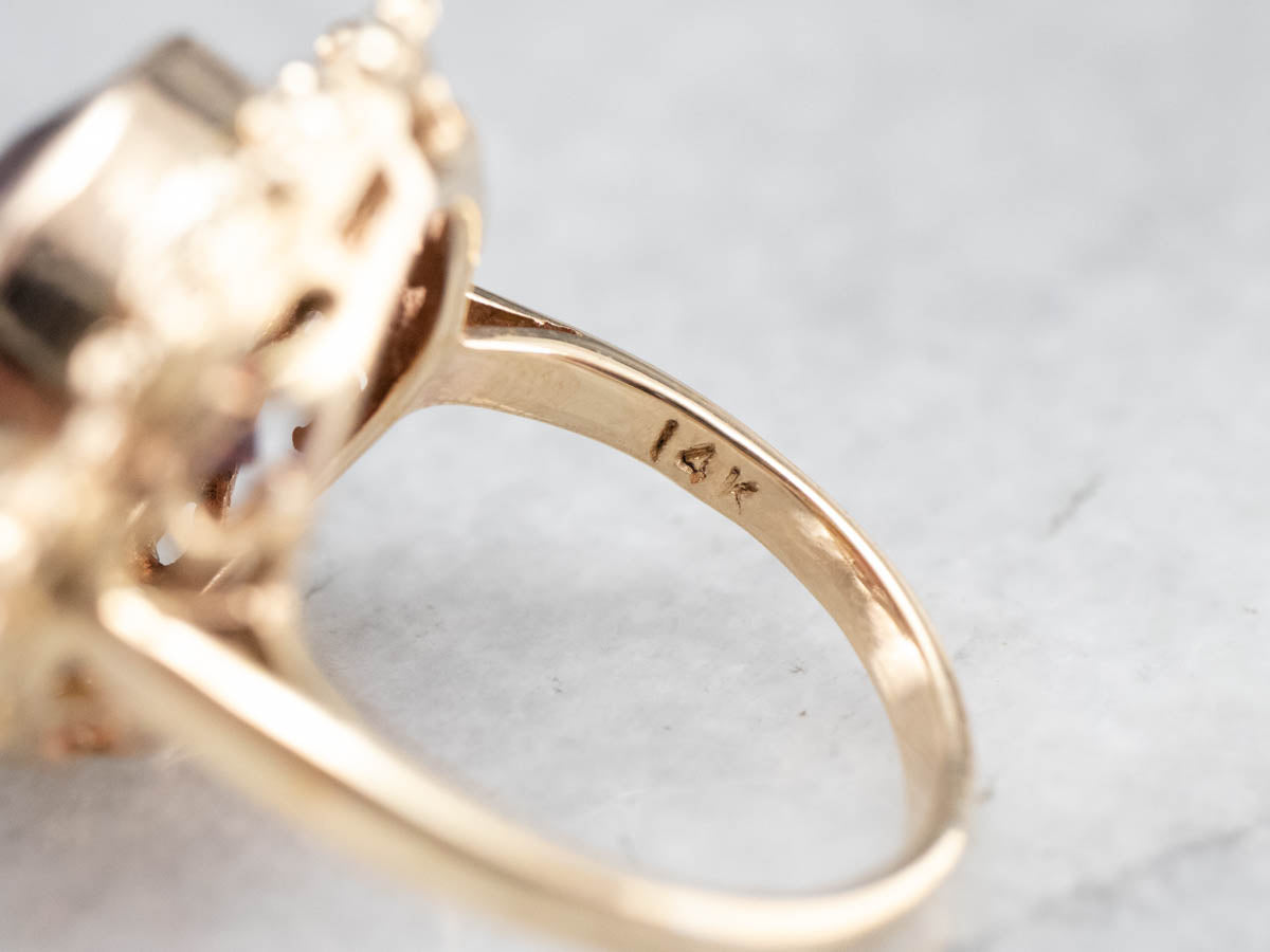 Timeless and elegant, this ring features a low profile and sweeping scrolling lines. Crafted of detailed yellow gold, this vintage ring has a stunning center, easy to wear and comfortable on the hand. The deeply saturated rhodolite garnet gem has a perfect cutting and is well proportioned to the golden frame.