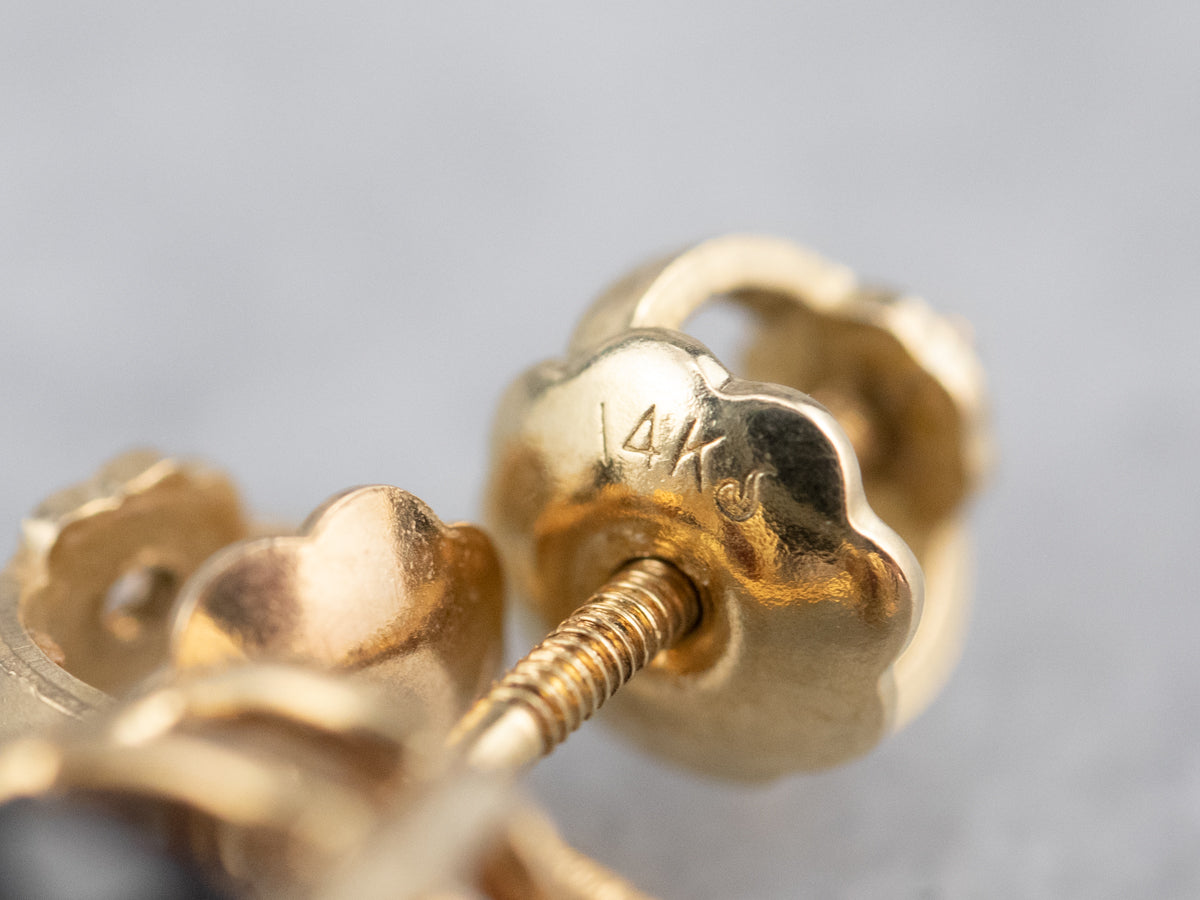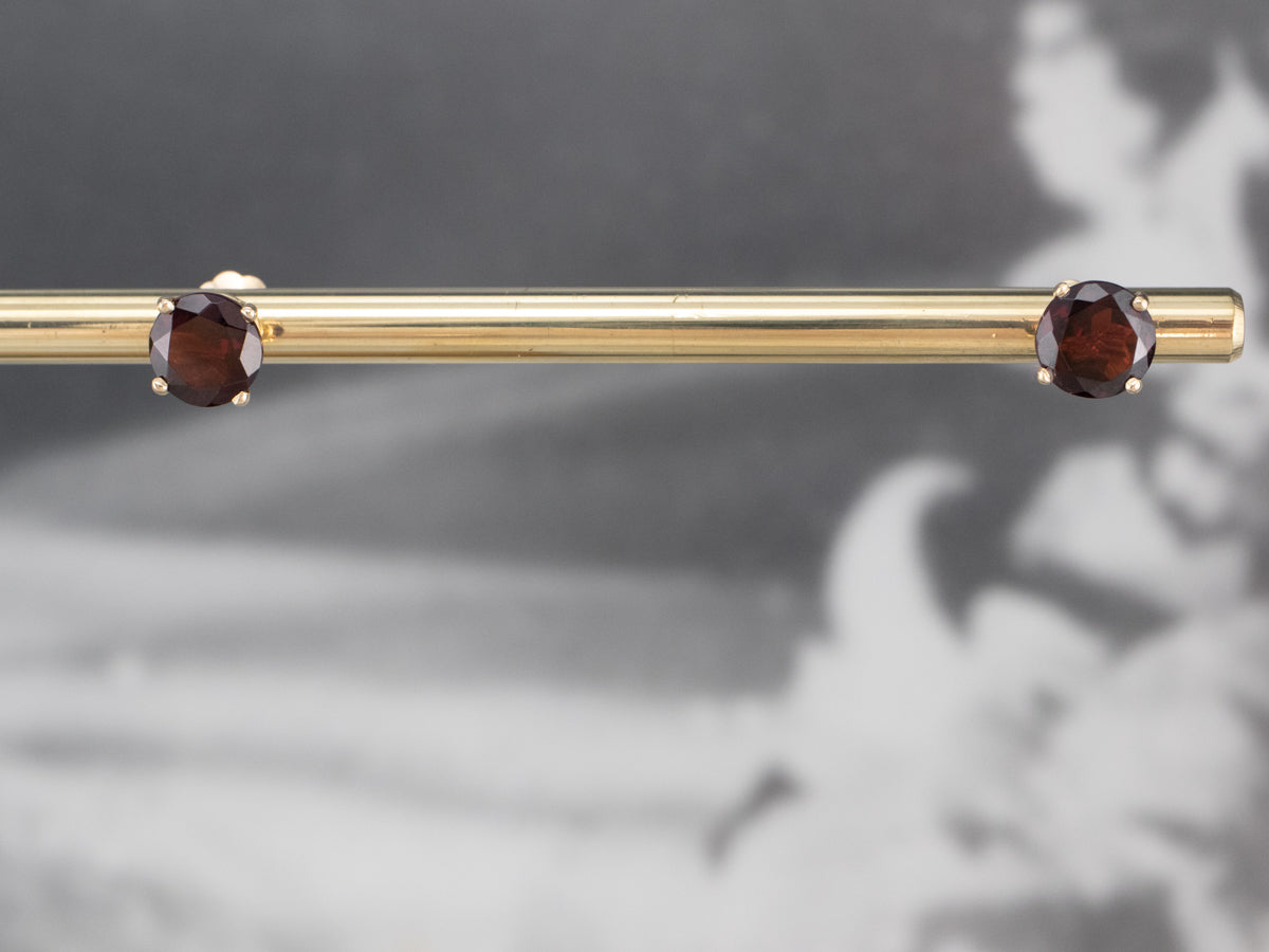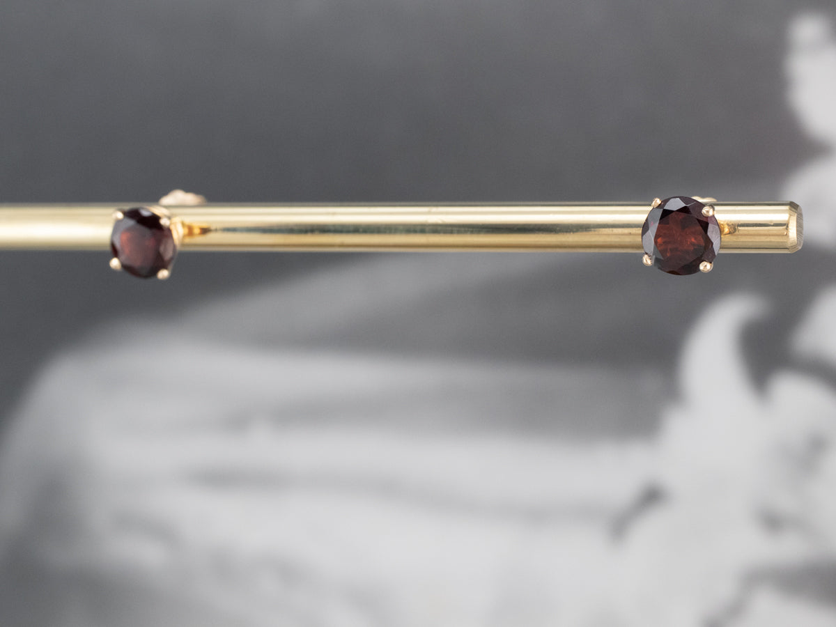 ¡Estos sencillos aretes son una adición versátil a cualquier colección de joyas! Son de oro amarillo de 14 quilates, un encantador complemento a los granates de color rojo intenso que se encuentran en el centro. Los fornituras con pasador de rosca mantienen estos aretes muy seguros y los hacen perfectos para el uso diario.