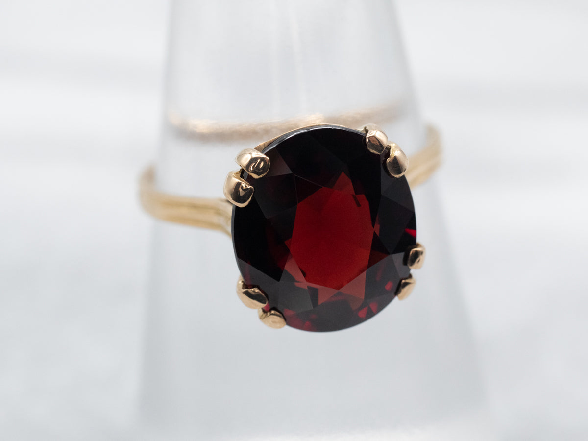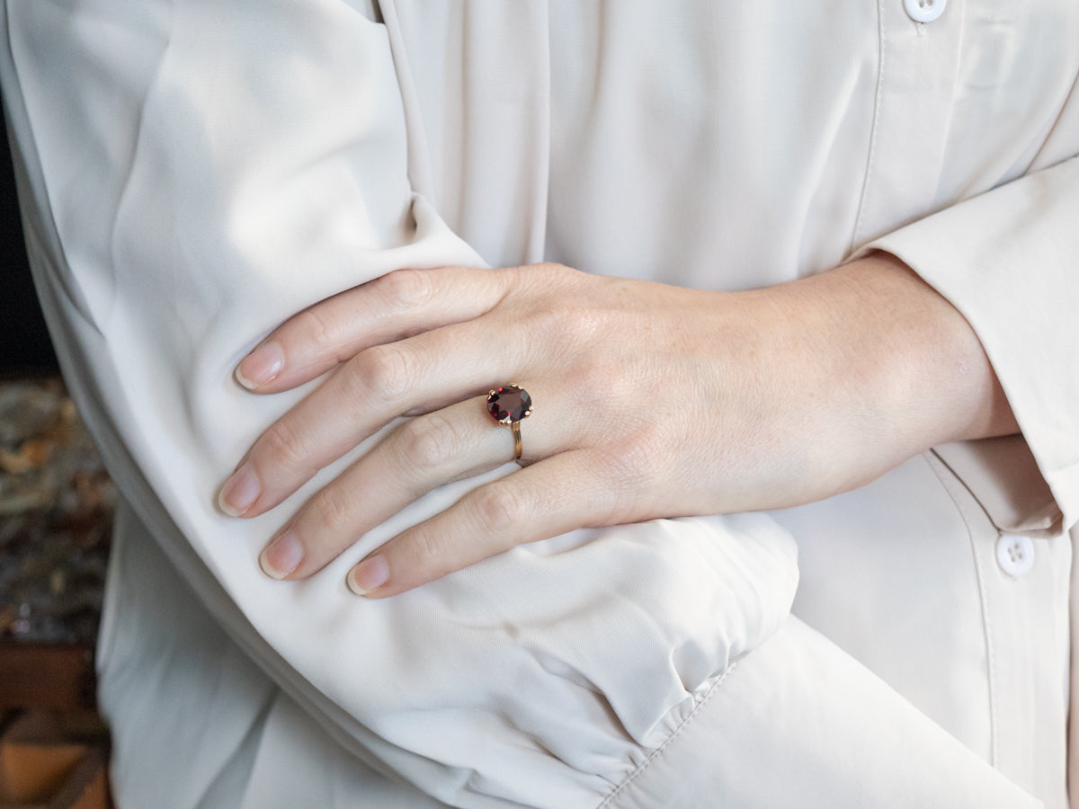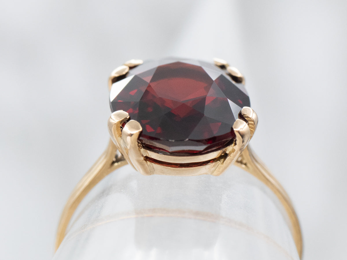 Este hermoso anillo solitario de oro amarillo presenta una única piedra preciosa granate. Su diseño atemporal y su calidad artesanal duran generaciones, proporcionándole una pieza de joyería atemporal durante décadas.